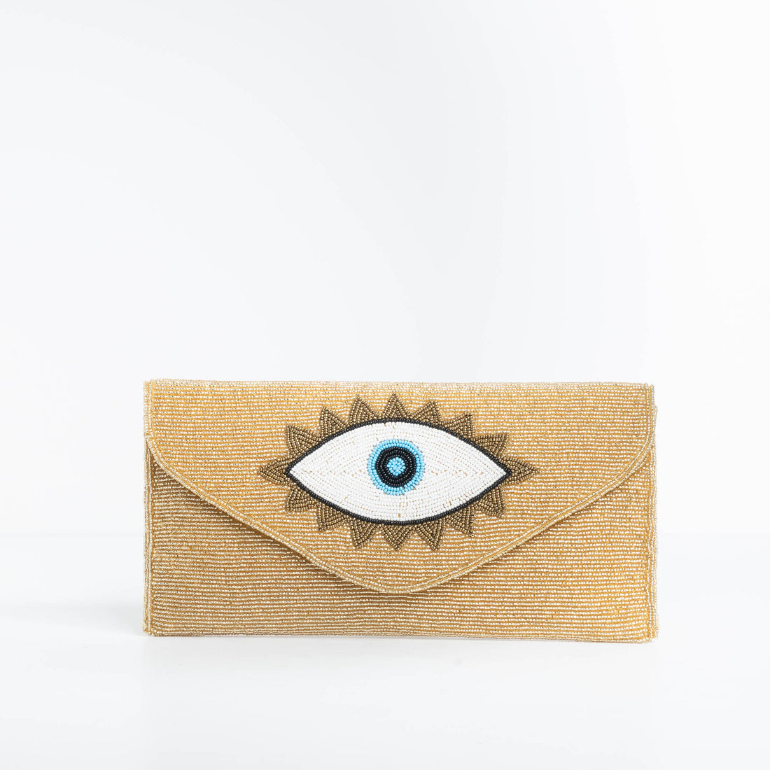 Enhance your look with our fashionable clutch, adorned with a lucky eye design and intricate...