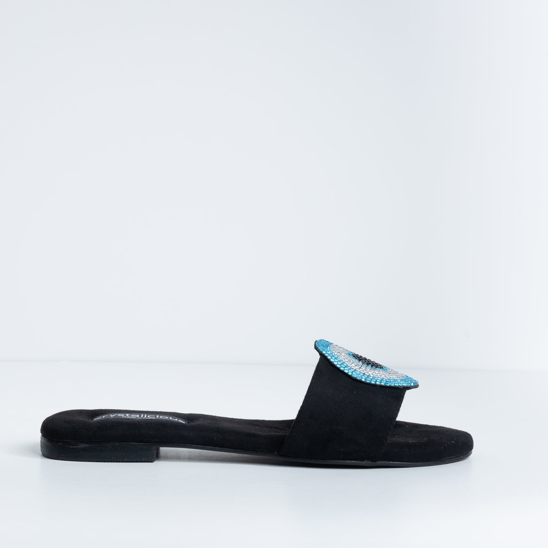 Enhance your style with our fashionable flats, featuring a lucky eye design on synthetic suede...