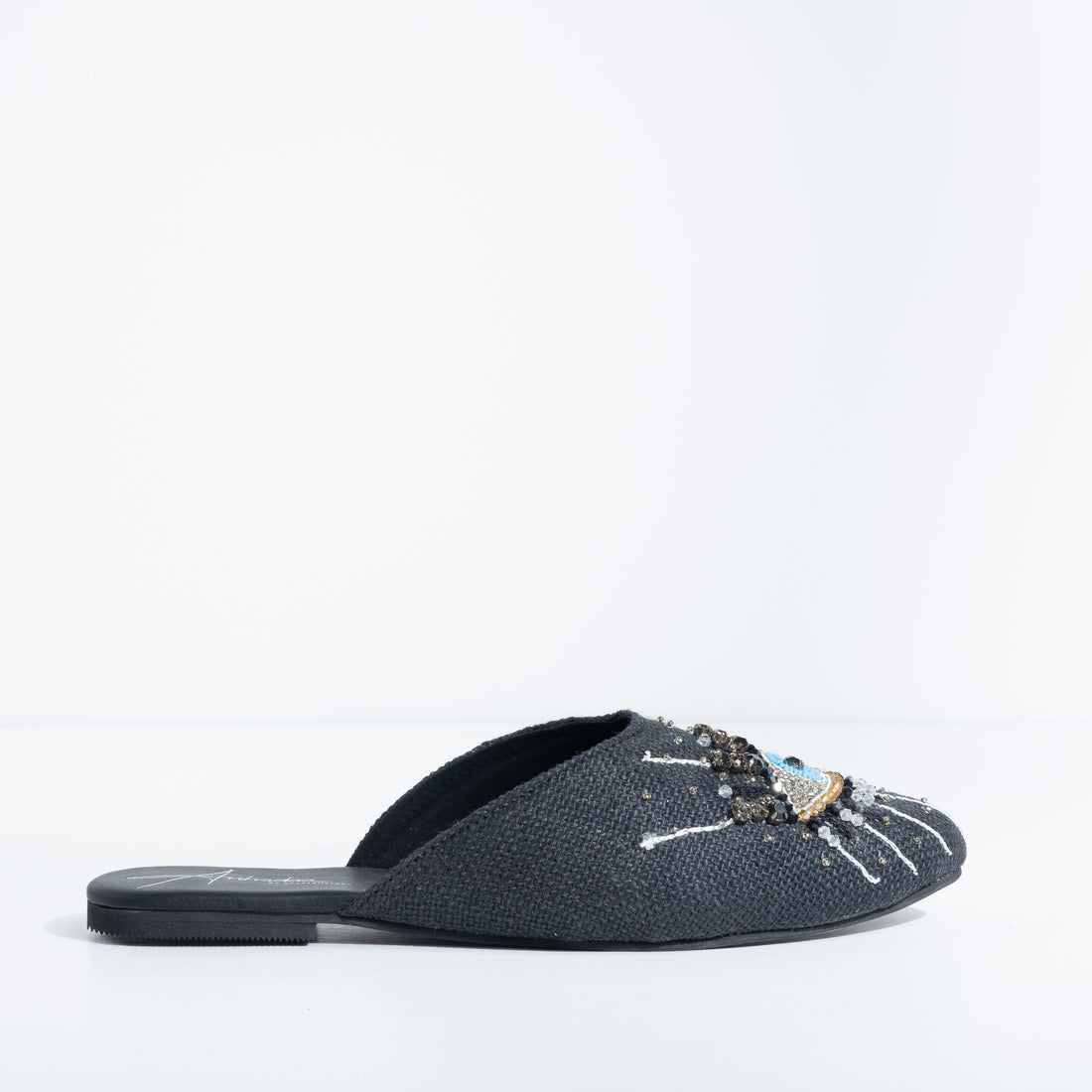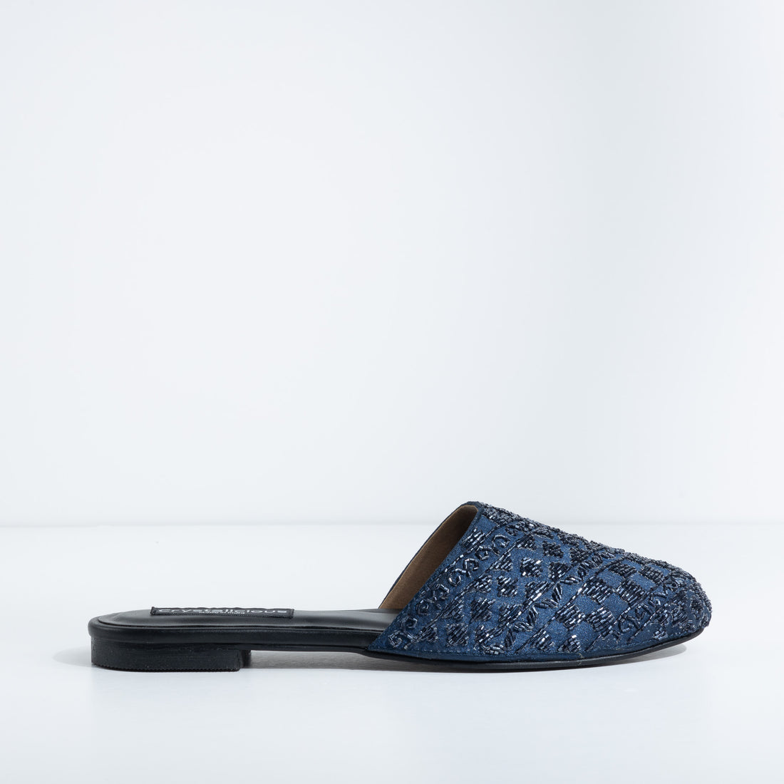 Step into style with our fashionable mule flats, featuring metallic embroidery and intricate thread art...