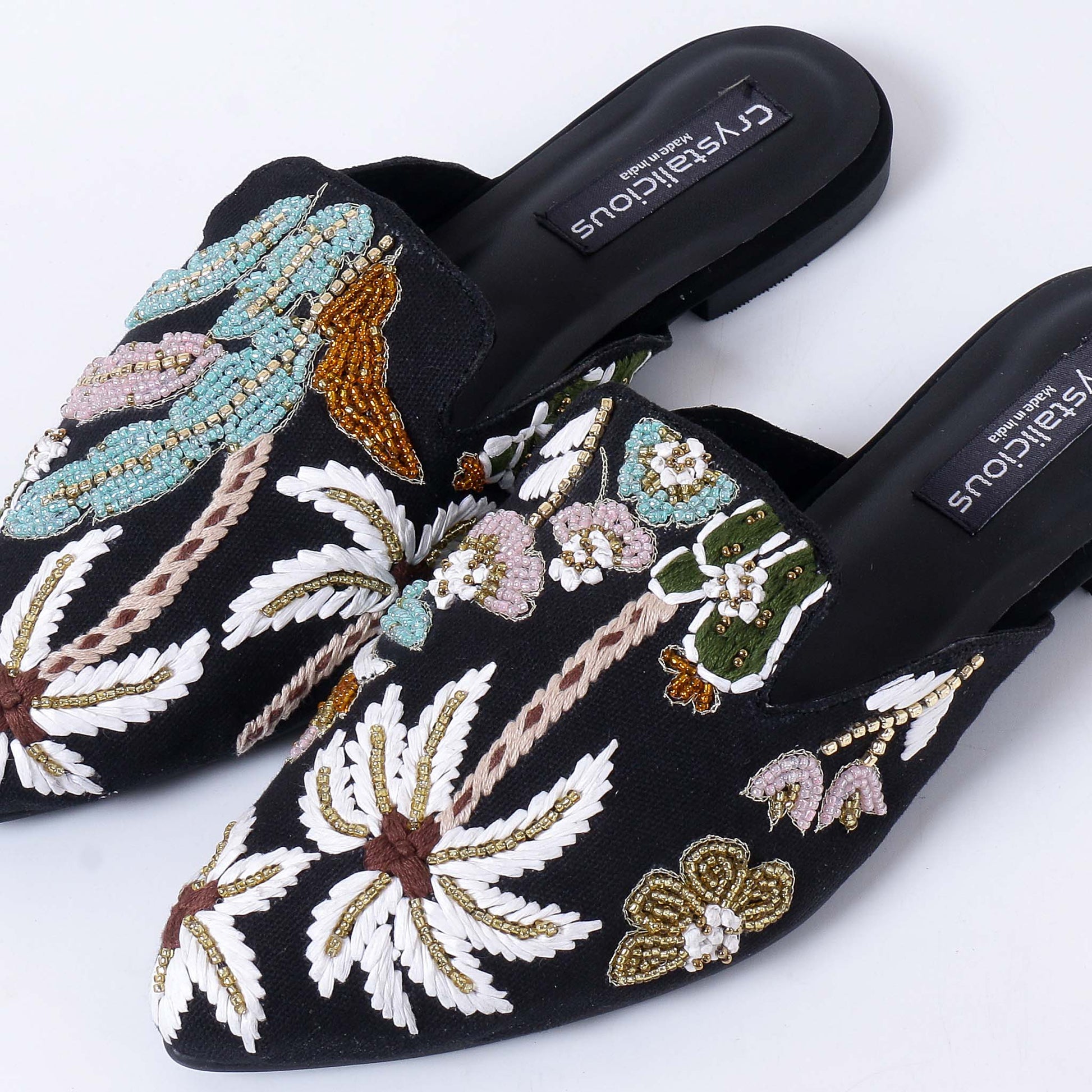 The Amelia Flat Mule is where comfort meets artistry. Crafted from premium cotton canvas fabric with a rubber sole, this eco-friendly mule is adorned with exquisite hand-embroidered palm and cactus motifs, reflecting the allure of Middle Eastern landscapes. A perfect choice for those who seek a blend of sophistication and sustainability.