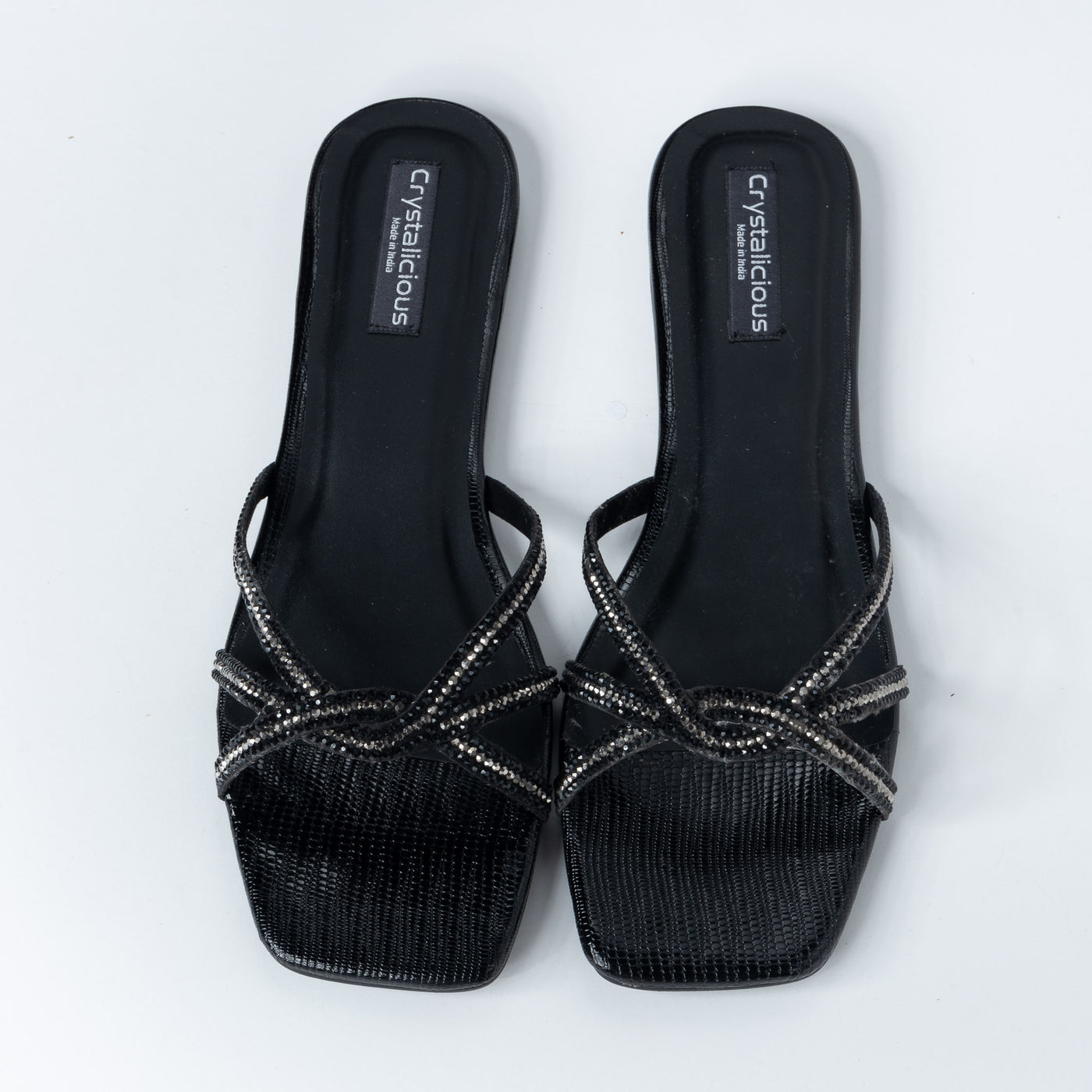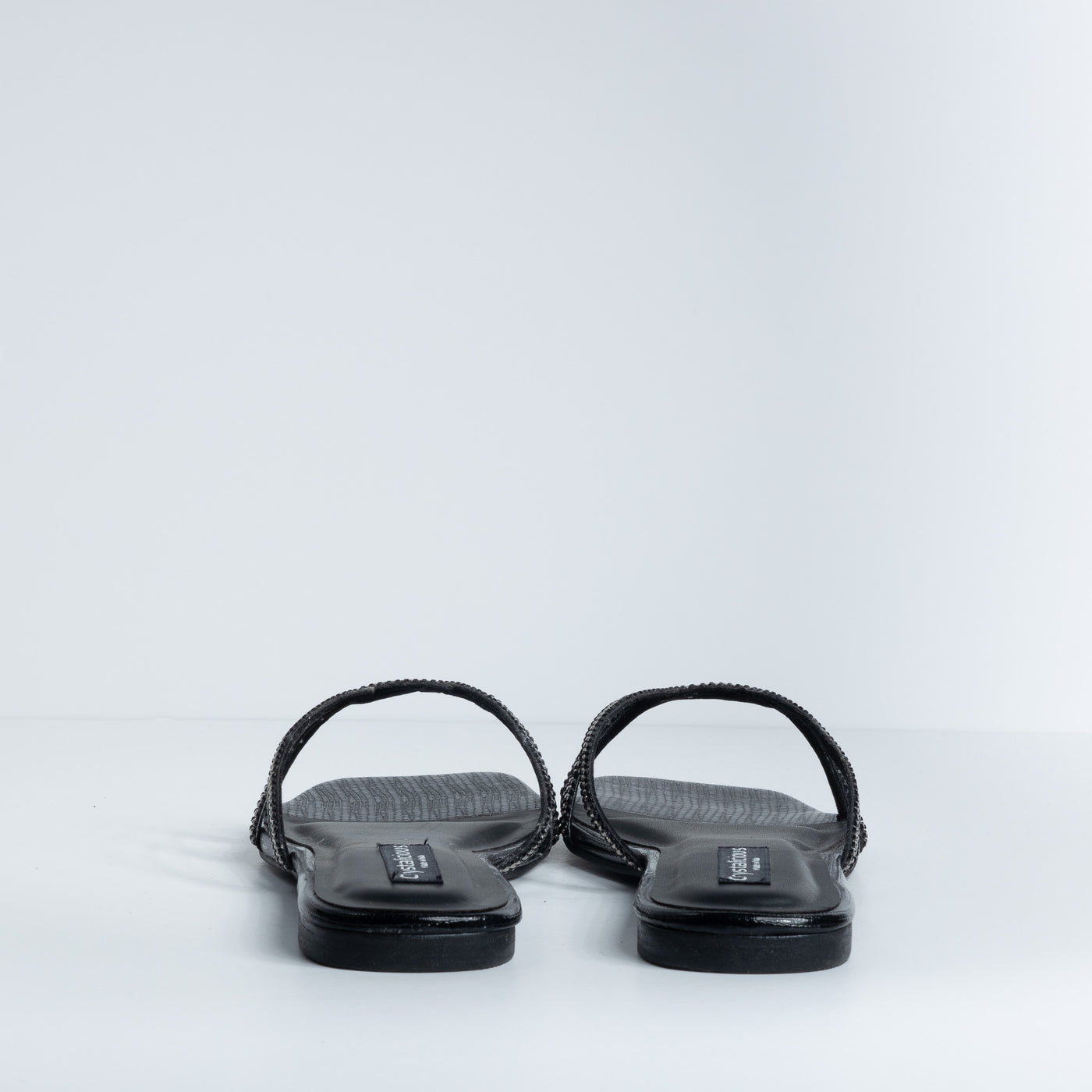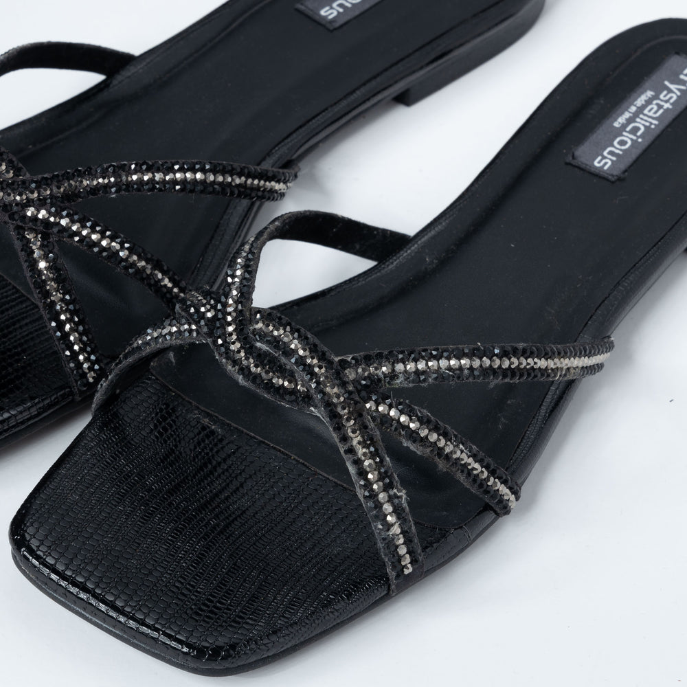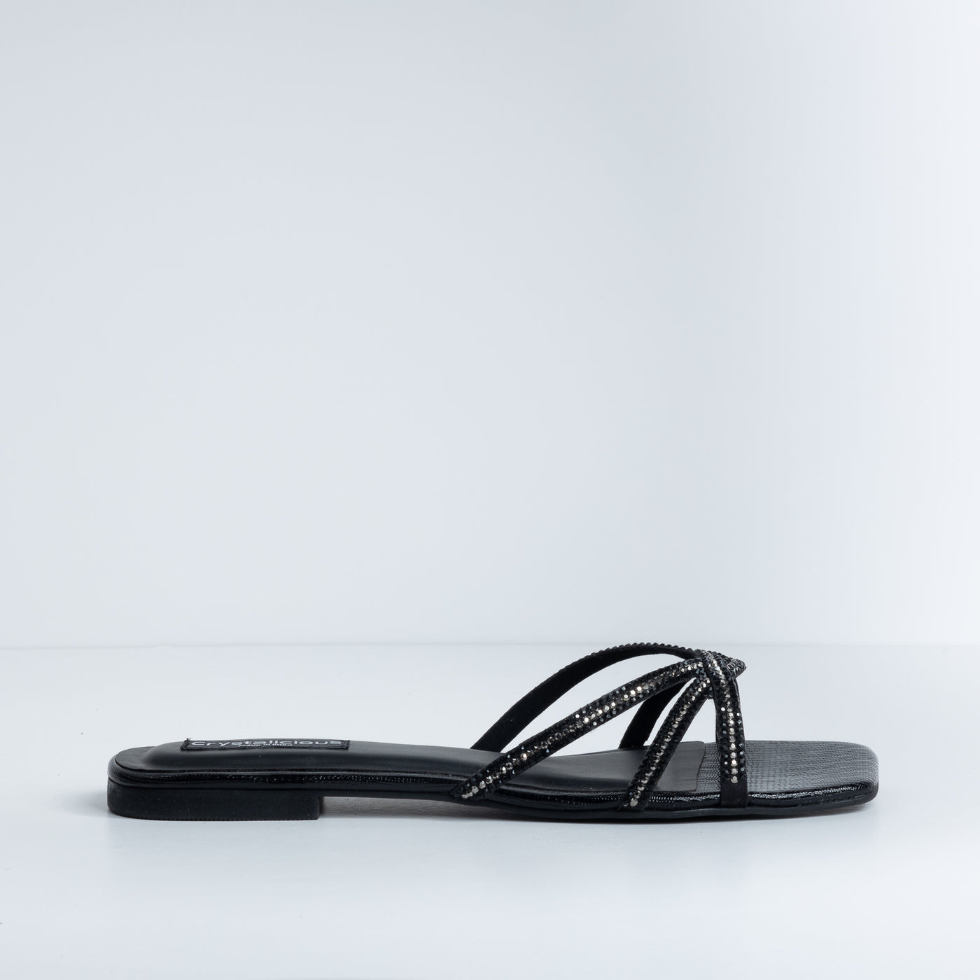 The Chloe Slider is a stunning combination of modern sophistication and unparalleled comfort. Crafted with a rubber sole, textured synthetic leather, and adorned with sparkling rhinestones, this slider offers a unique style that stands out. Its square toe shape and distinctive design make it the perfect slider to effortlessly transition from day to evening wear.