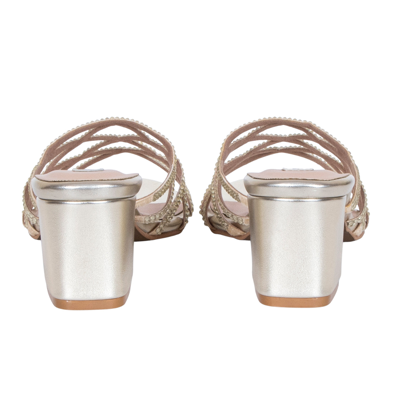 The upper is adorned with finely placed black embellishments that subtly catch the light, making these sandals perfect for both daytime elegance and evening glamour. The open square toe design enhances breathability and adds a contemporary edge, allowing for effortless styling with a wide range of outfits.