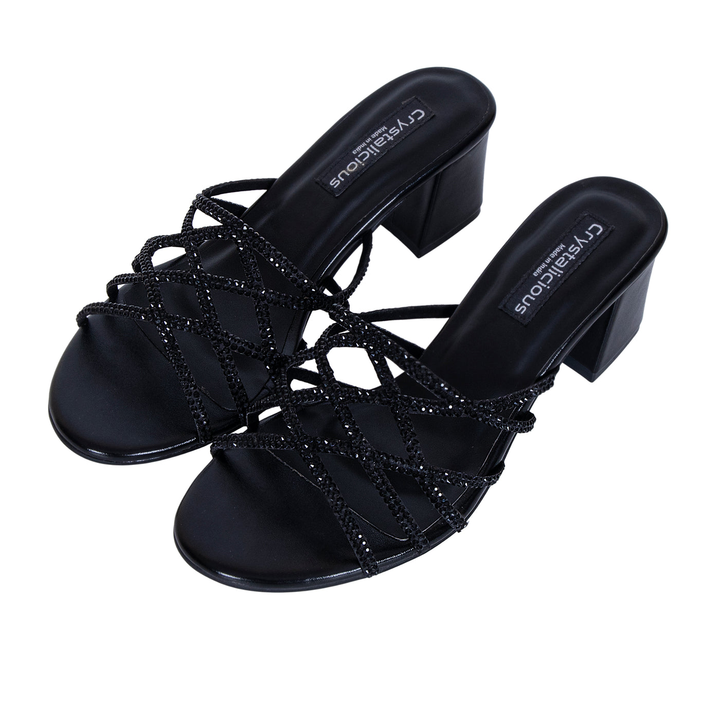 Elevate your footwear collection with these elegant black embellished mule sandals, crafted to deliver both style and comfort. Designed with a modern slip-on silhouette, this pair features intricately detailed criss-cross straps that add a touch of refined sparkle while maintaining a sophisticated, minimal look.