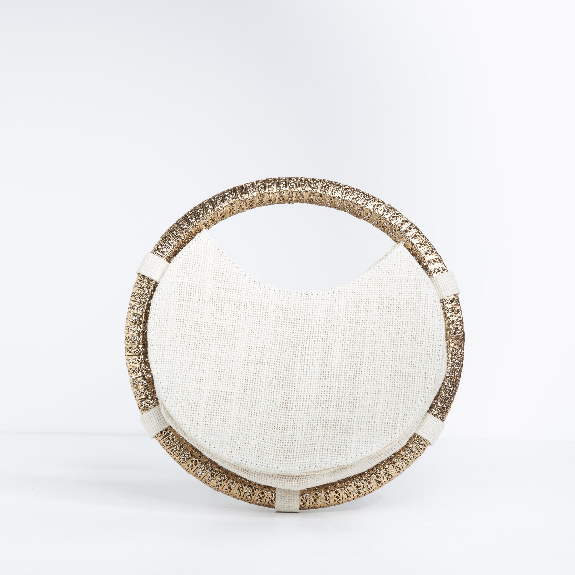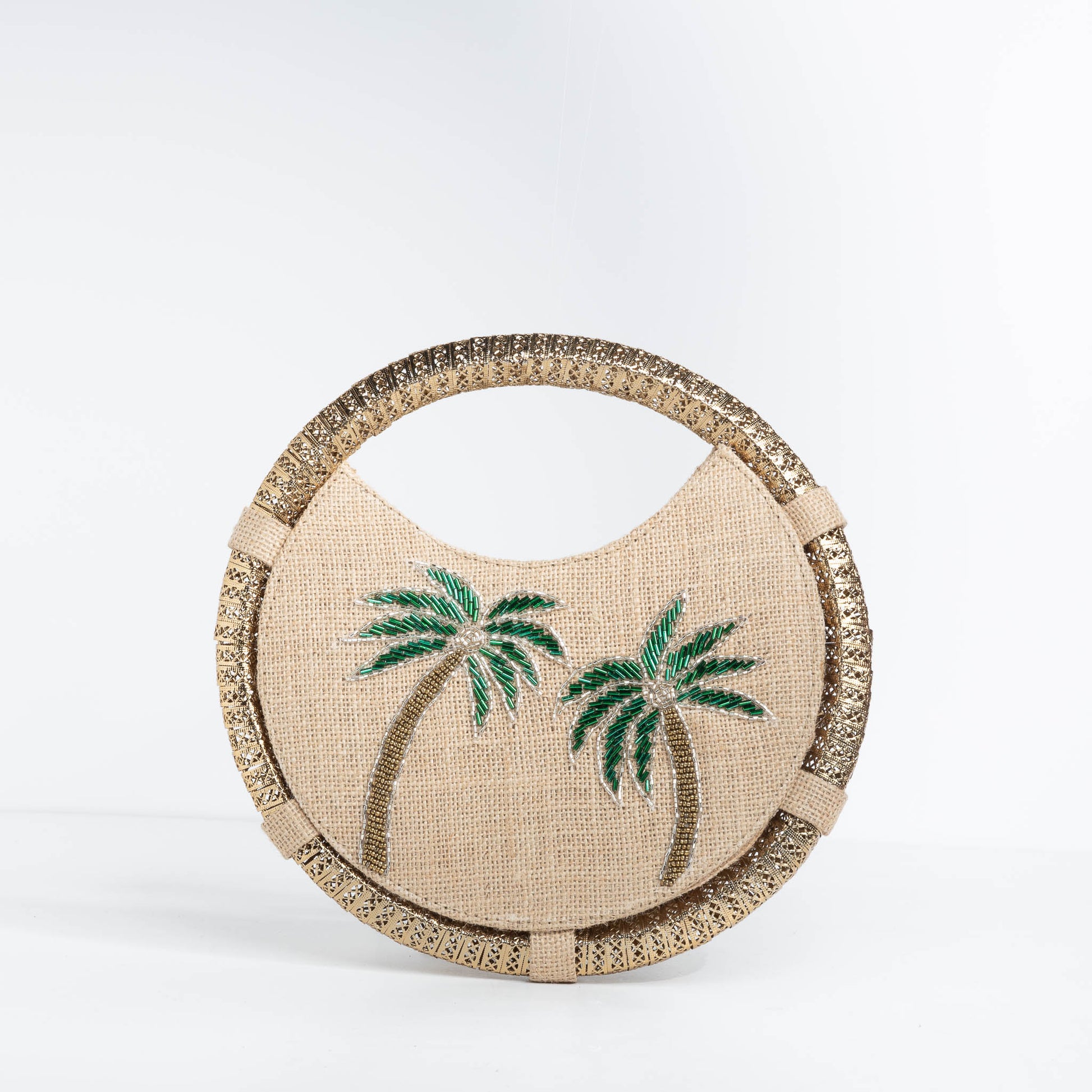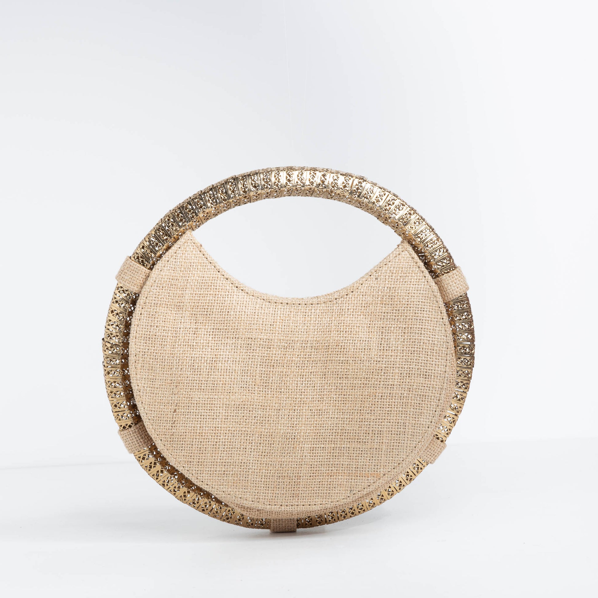 Experience the exquisite feel of nature with our fashionable circular jute bag, adorned with palm metallic embroidery. Crafted by skilled craftsmen in Bharat, this sturdy bag combines coziness and style. Perfect for any occasion. Explore the exclusive collection from Crystalicious now.