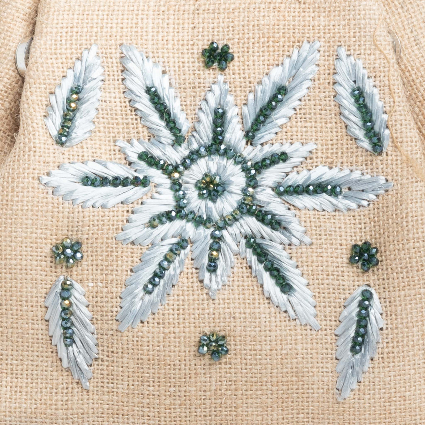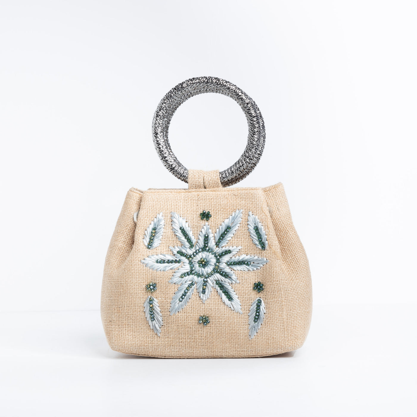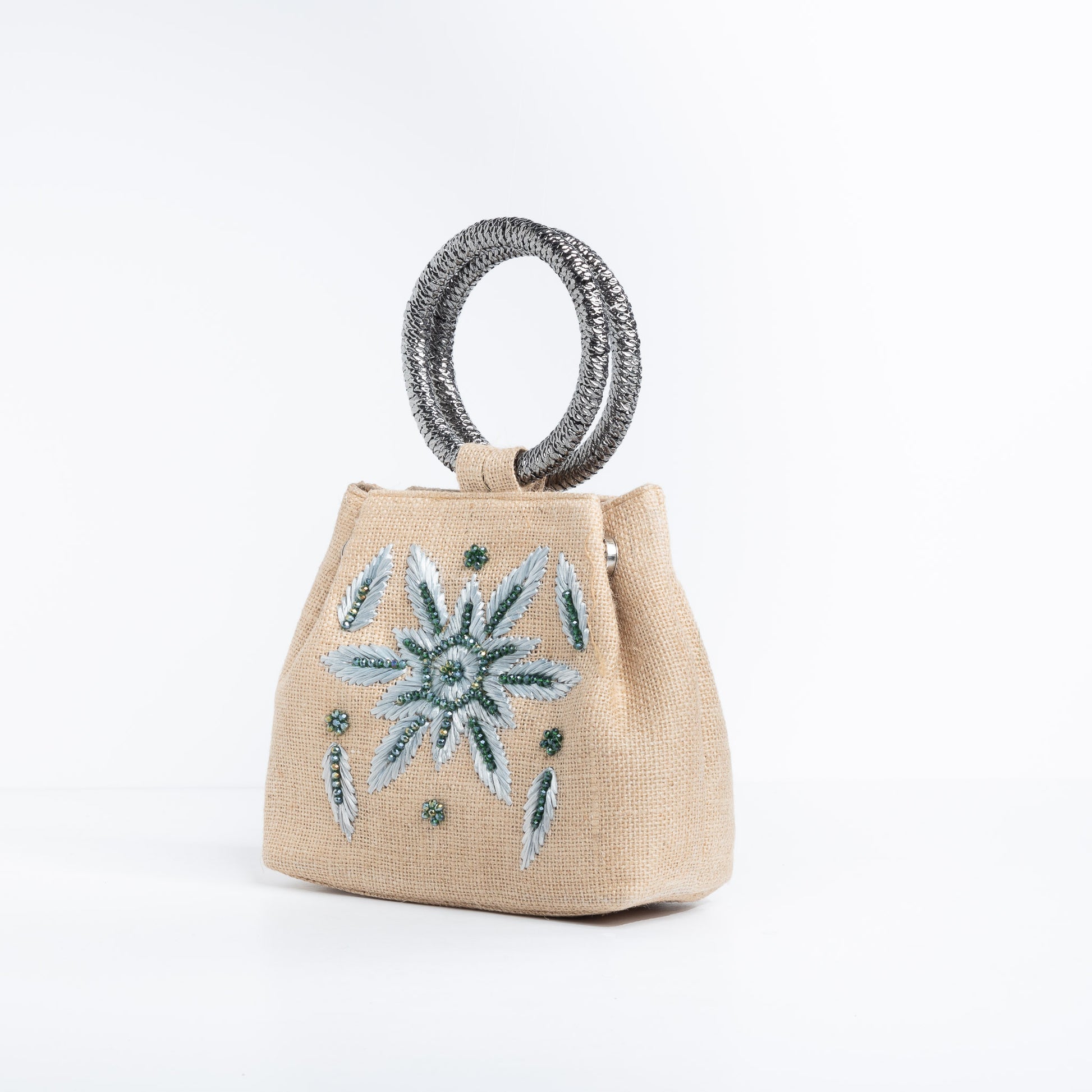 The Isabell Satchel Bag blends timeless elegance with eco-conscious craftsmanship, making it a must-have accessory for those who value both style and sustainability. Crafted from burlap fabric enhanced by raffia work, adorned with shimmering crystal beads, and featuring sleek metal handles, this satchel exudes sophistication with its distinctive design and functional appeal.