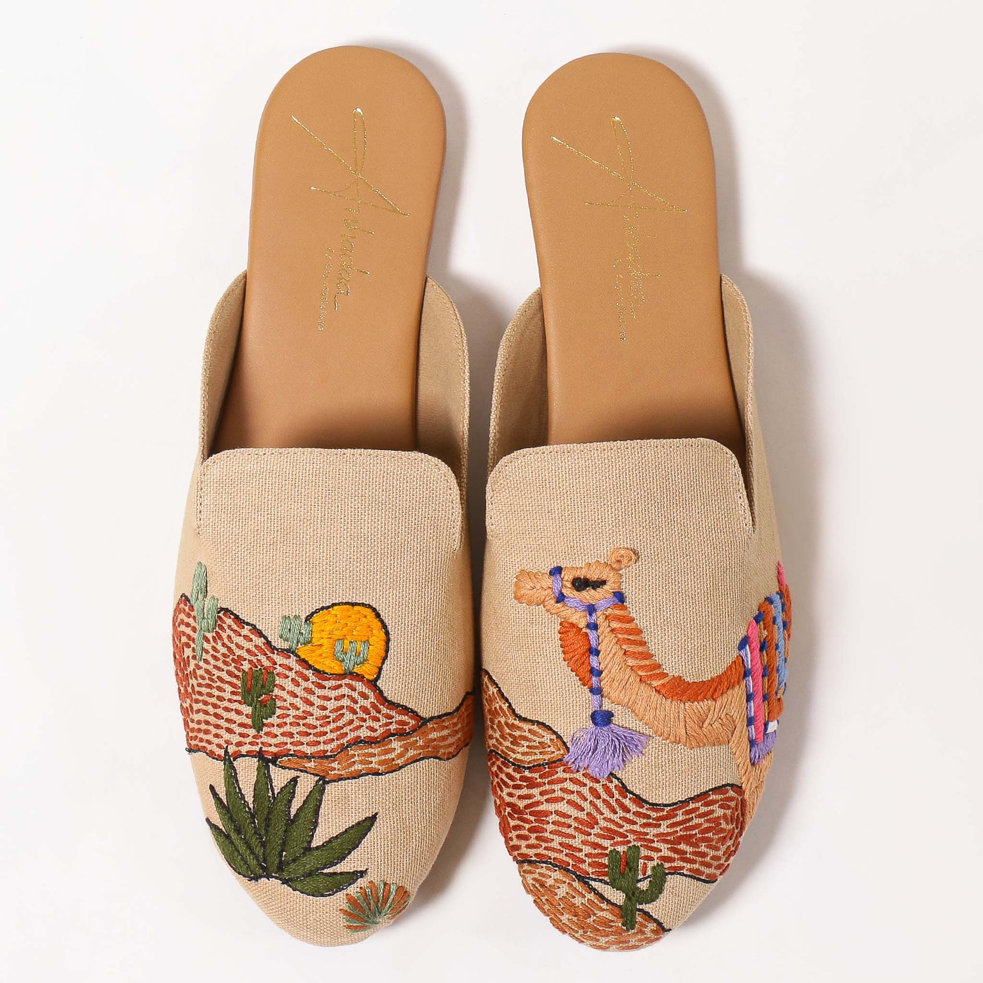 The Kinsley Mule is where timeless craftsmanship meets storytelling design. Expertly handcrafted with faux leather, a durable rubber sole, and detailed thread embroidery, this flat mule brings to life the spirit of traditional Arab culture through charming camel and desert motifs. With its round toe shape and elegant silhouette, Kinsley is the perfect companion for those who value understated luxury with cultural depth—allowing Kinsley to strike the perfect balance between chic and comfort.