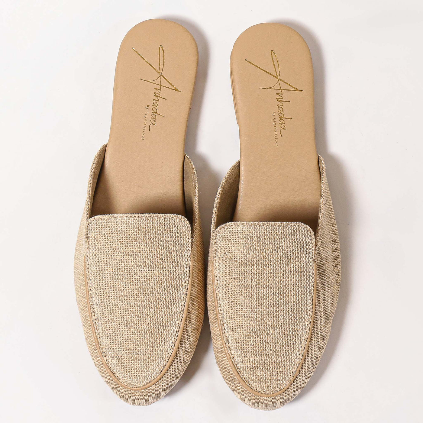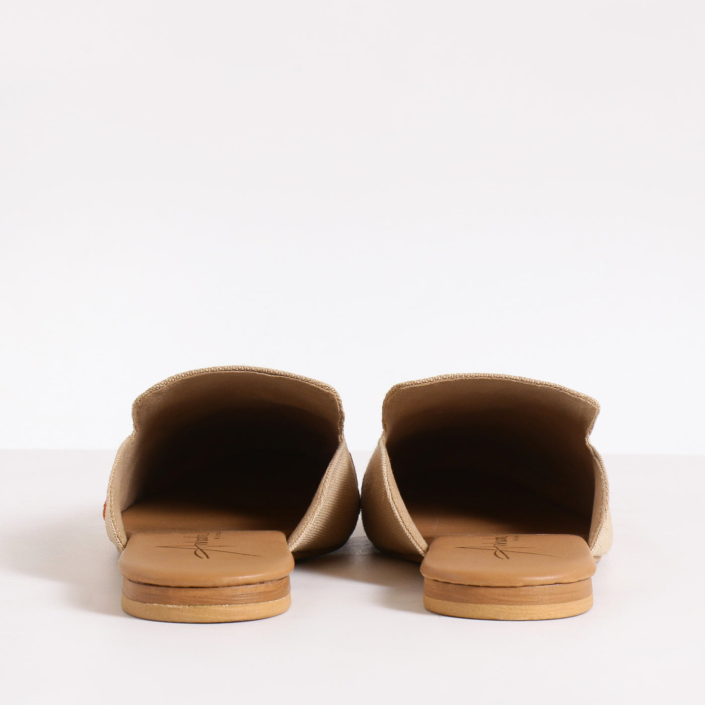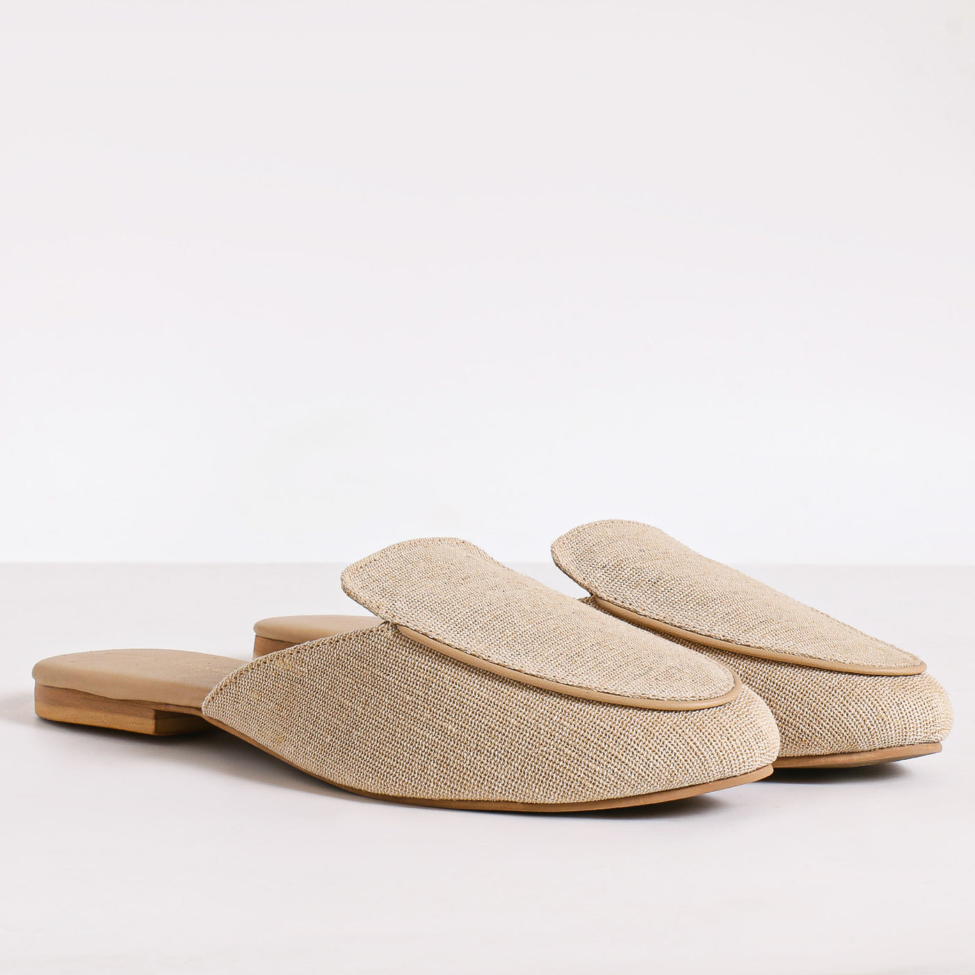 The Loren Mule is the epitome of effortless sophistication, designed for those who appreciate timeless elegance with a touch of sustainable luxury. Crafted with faux leather, a durable rubber sole, and a burlap upper, this mule offers a unique blend of textures, creating a refined yet contemporary look. With its round toe shape, elegant silhouette, and chic detailing, Loren is the perfect choice for those who seek both style and comfort.