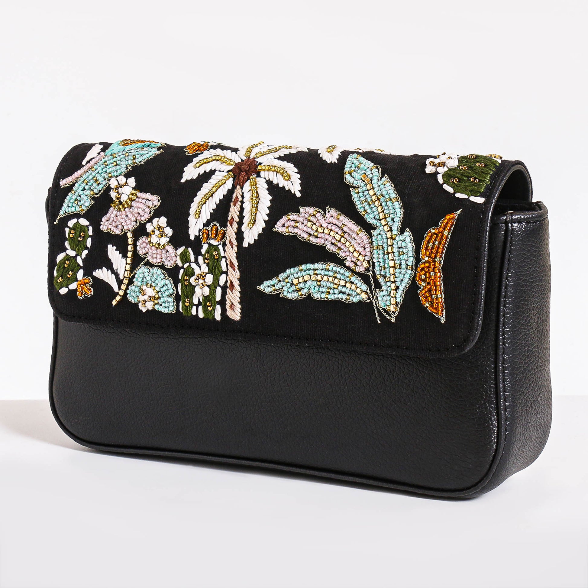 The Luna Crossbody Bag is the perfect blend of artisanal craftsmanship and modern sophistication. Designed for those who seek elegance with a touch of artistic detail, Luna features hand-embroidered elements with beads and thread, creating a stunning palm motif on a sleek faux leather exterior. This eco-friendly, animal-free handbag exudes timeless charm, making it a must-have for any wardrobe.