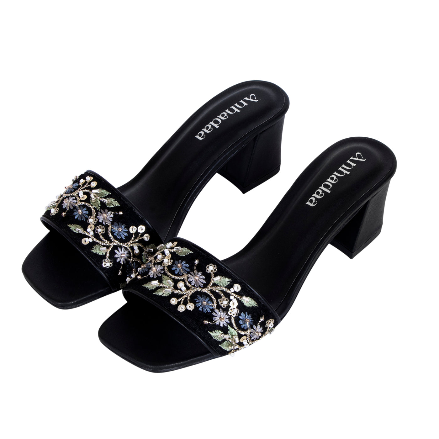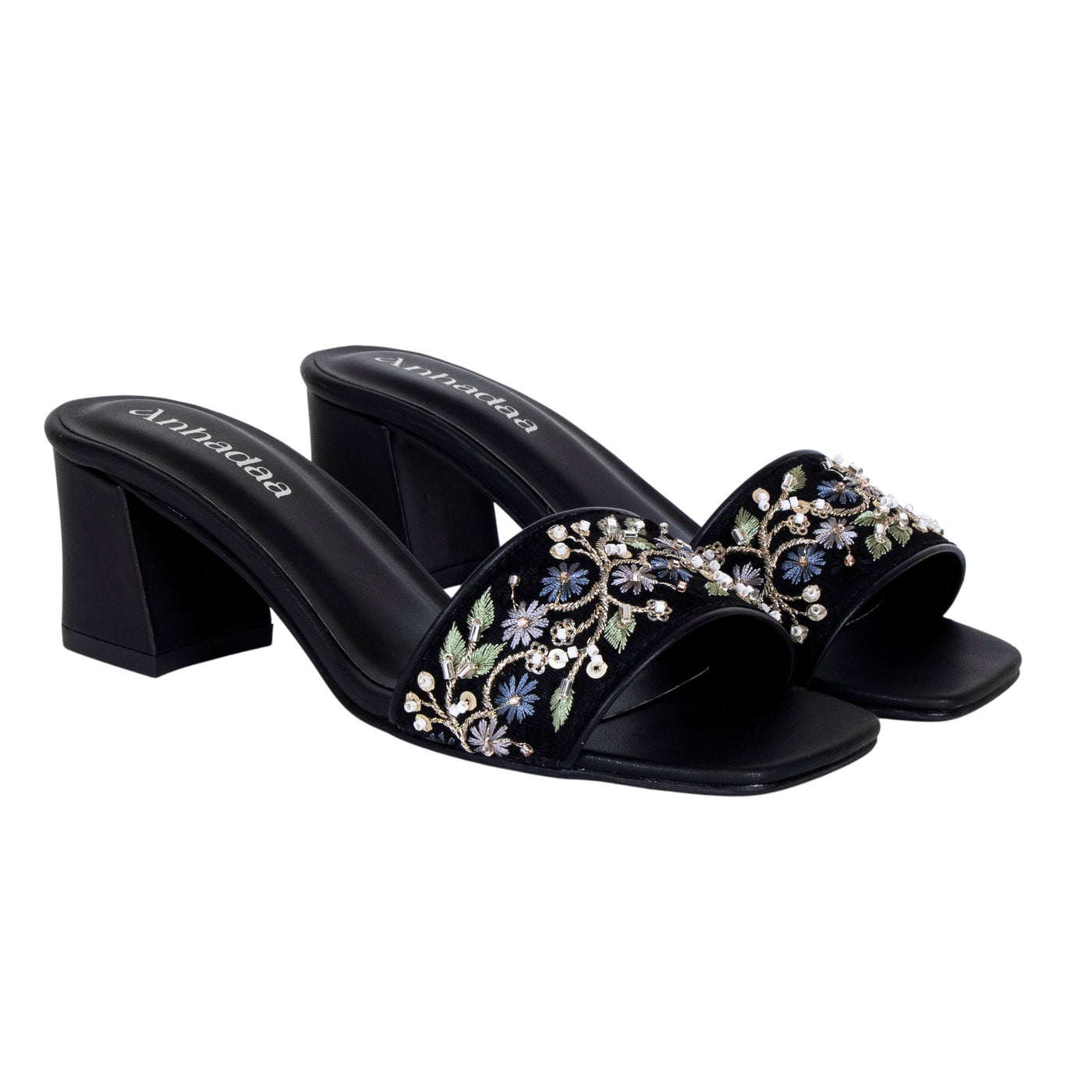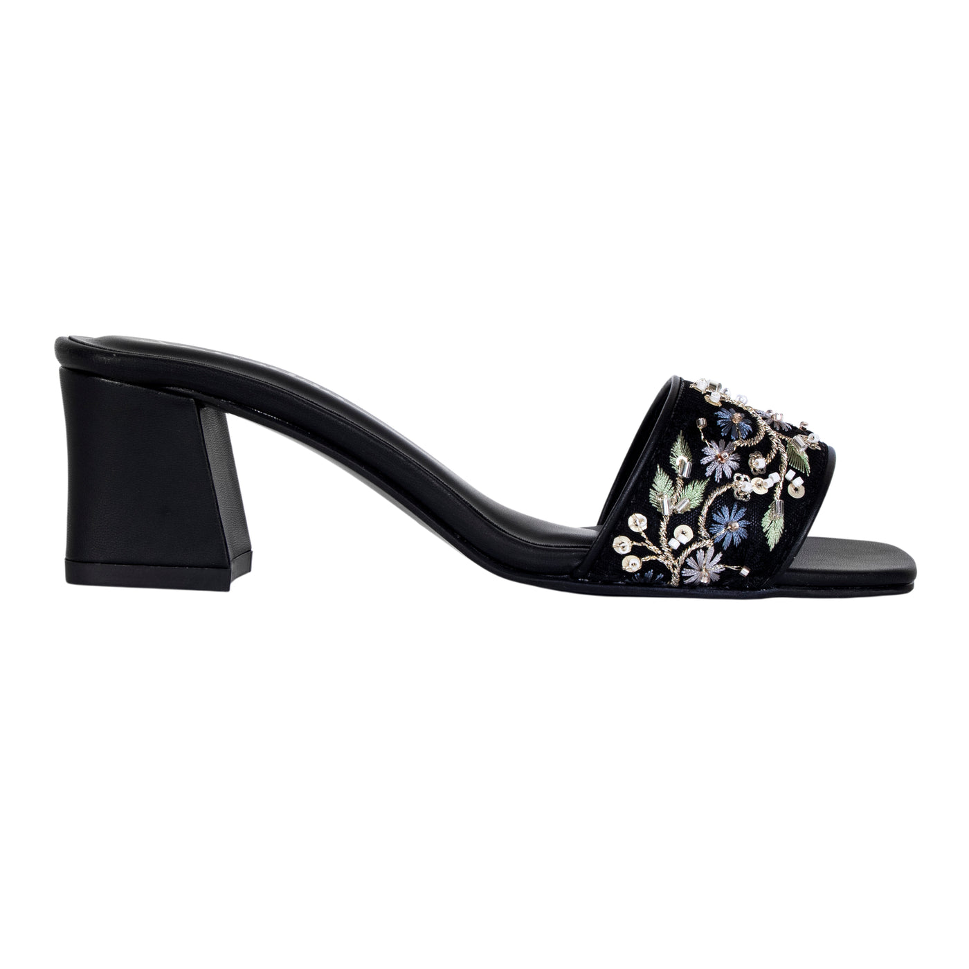 Step into effortless elegance with these stunning black embellished block heel sandals. Designed with a sleek open-toe silhouette, this pair features a beautifully embroidered strap adorned with delicate floral detailing and subtle bead embellishments, adding a touch of sophistication and charm.