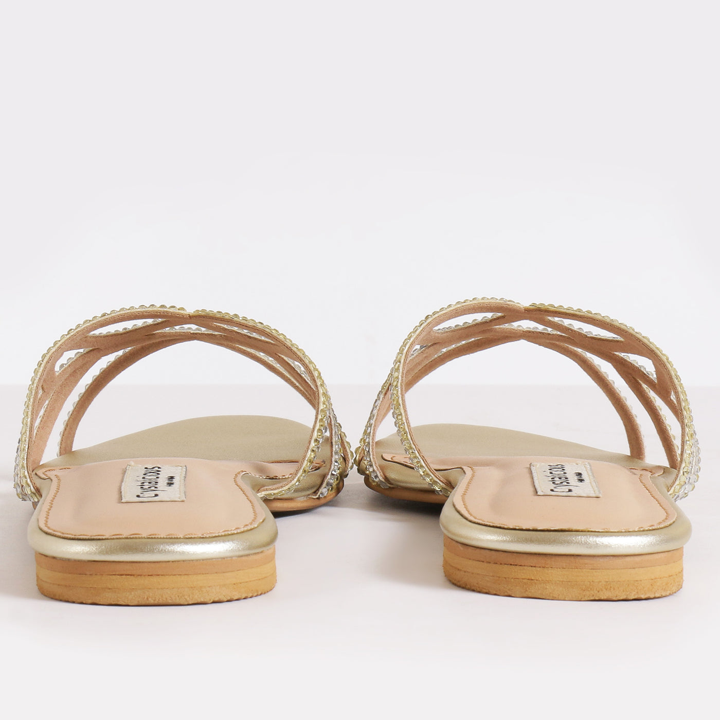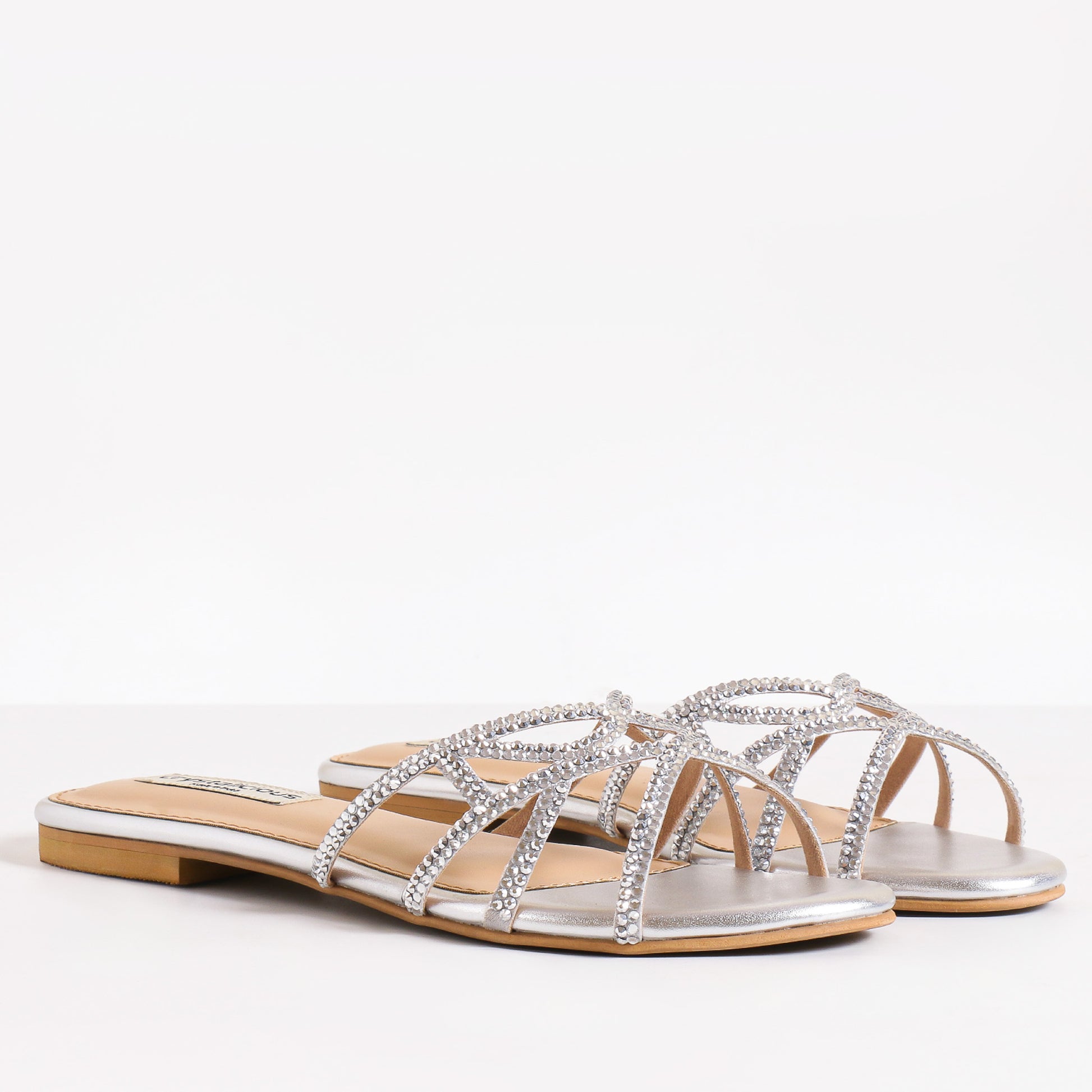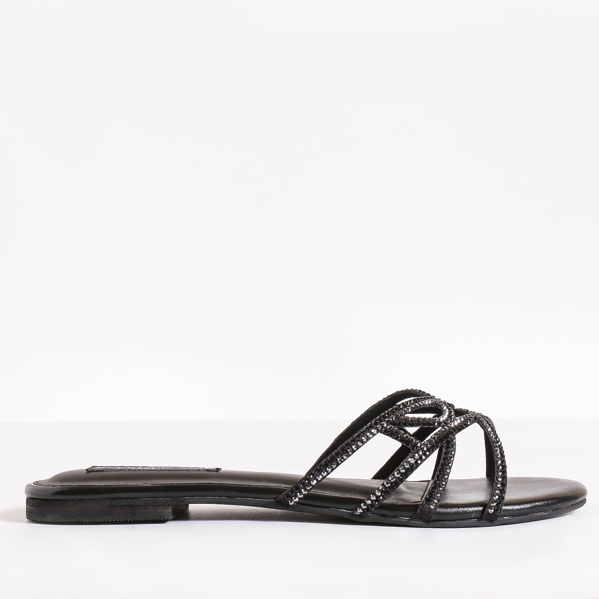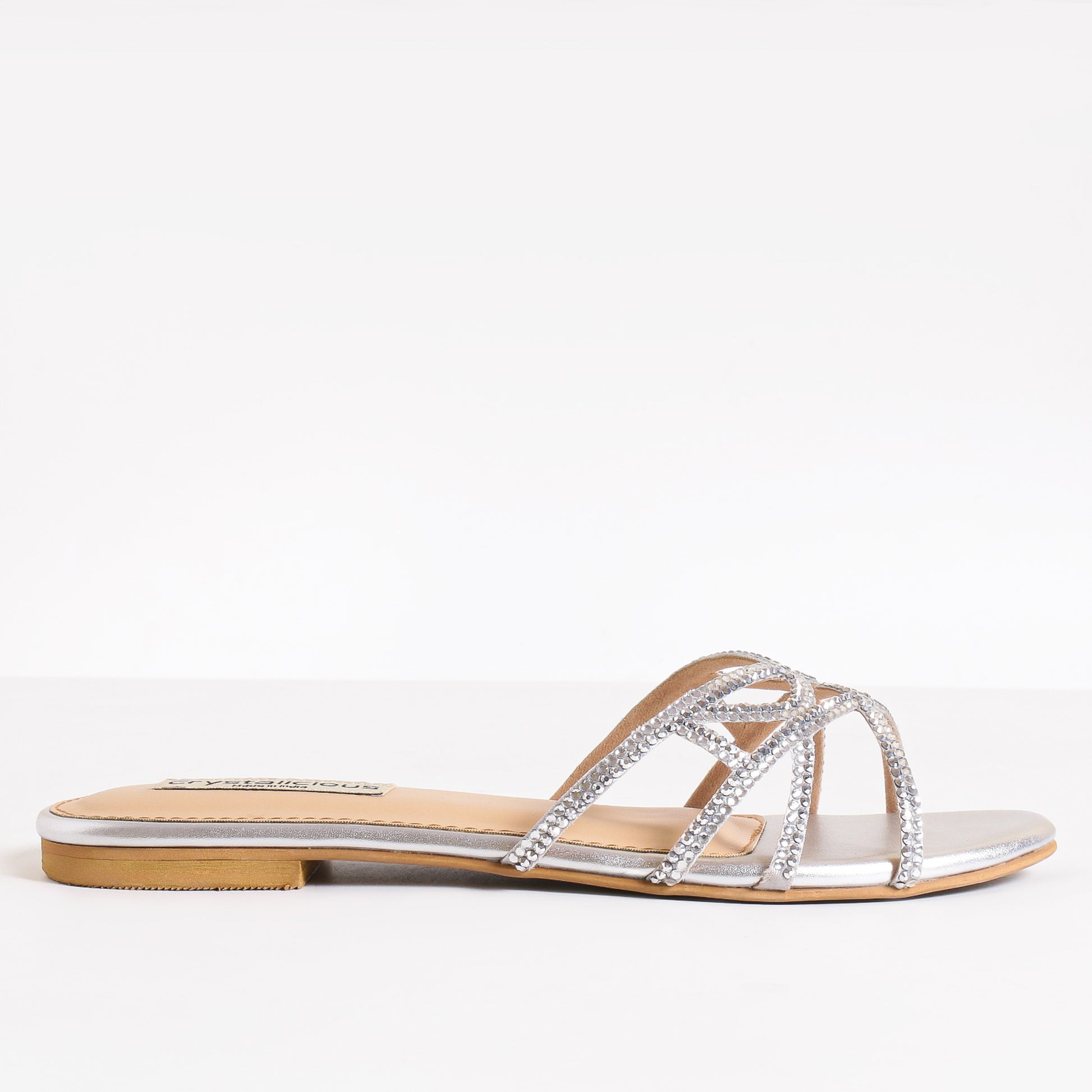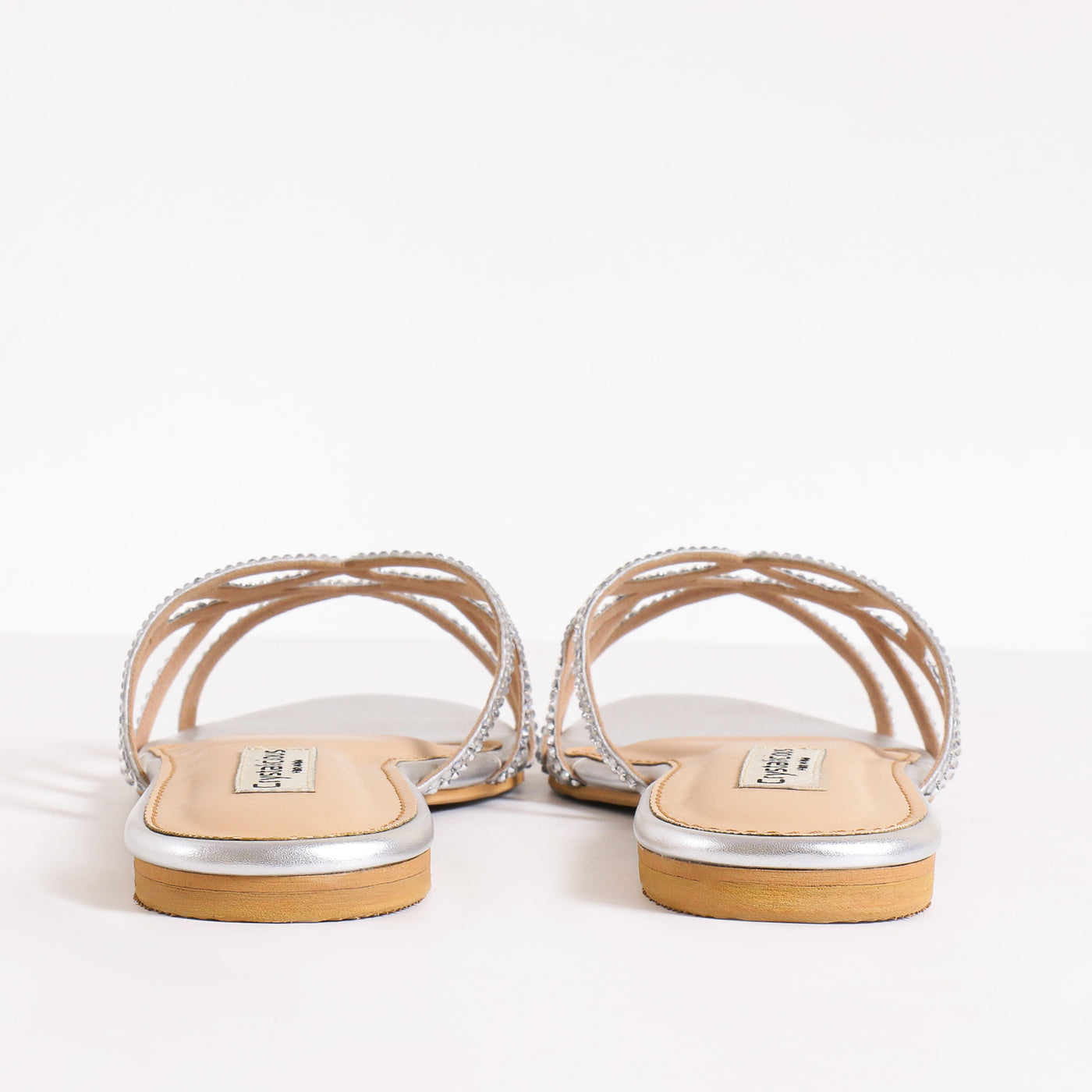 The Nyra Slide Sandal is a stunning fusion of elegance and ease, designed for those who appreciate refined style without compromising on comfort. Handcrafted with faux leather, a durable rubber sole, and adorned with shimmering rhinestones, Nyra exudes sophistication. With its flat, elegant design, round toe shape, and dazzling embellishments, this sandal is the perfect accessory for any occasion.
