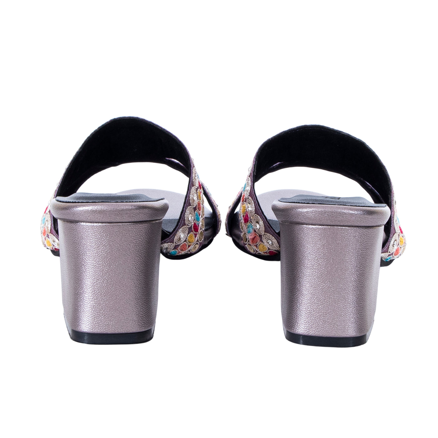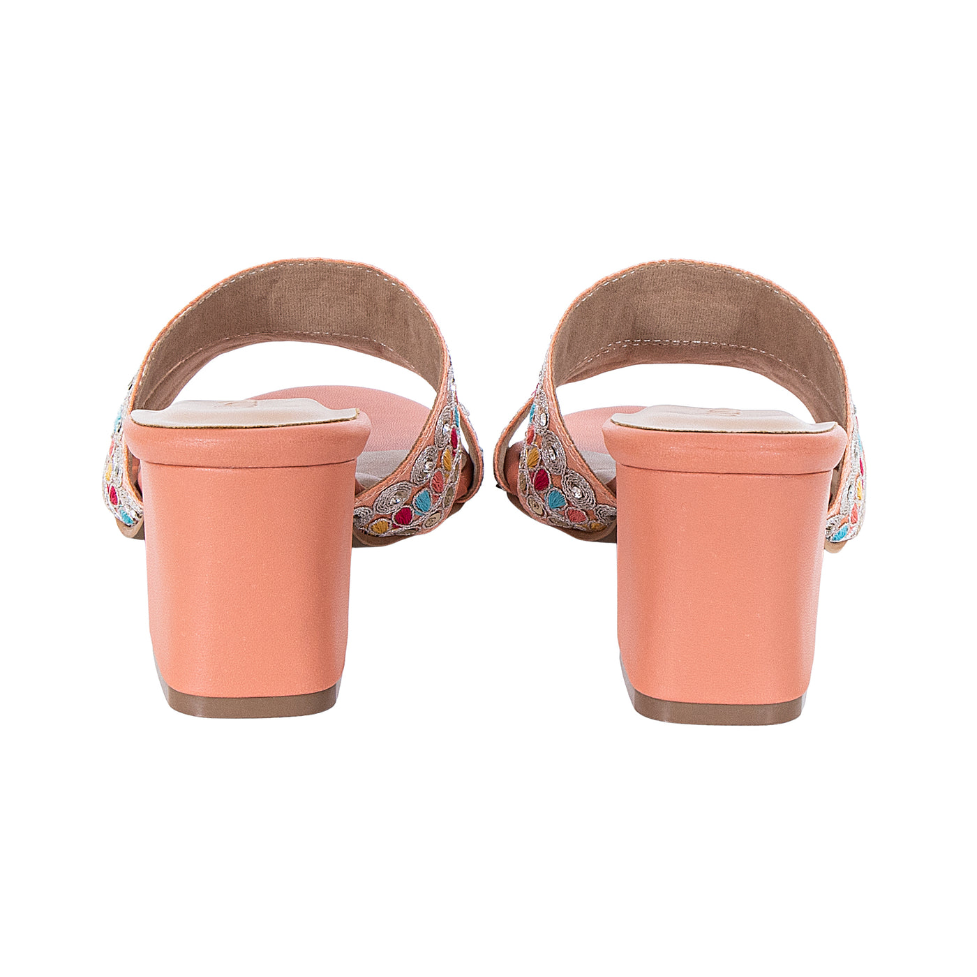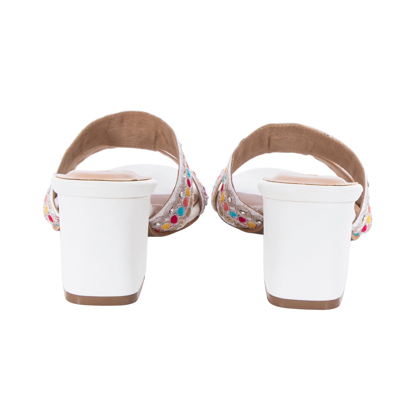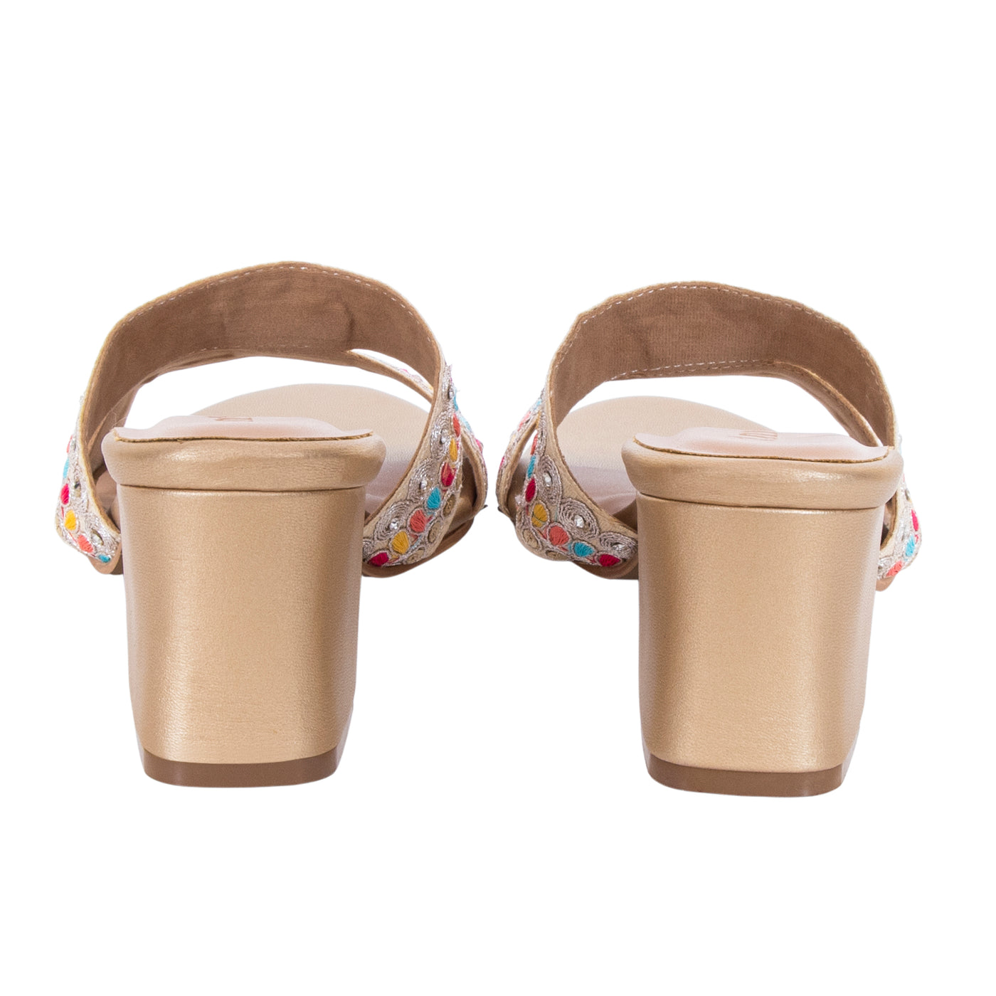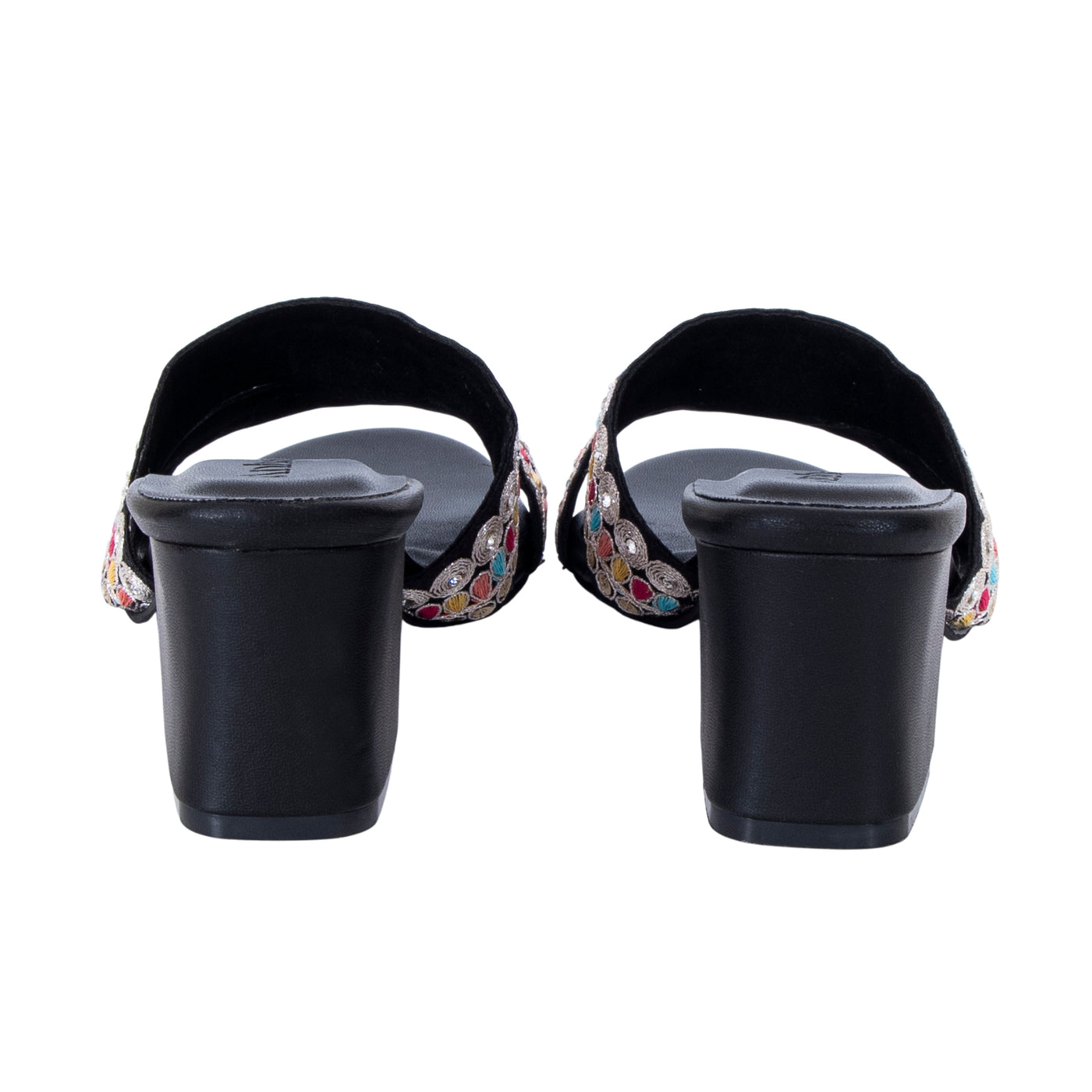Add a vibrant touch to your festive wardrobe with these beautifully embroidered block heel sandals. Designed with dual straps featuring intricate multicolor thread work and delicate embellishments, this pair blends traditional charm with modern elegance.