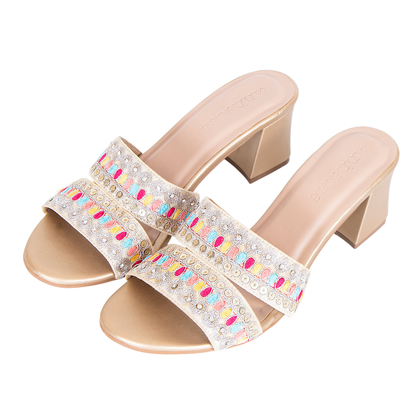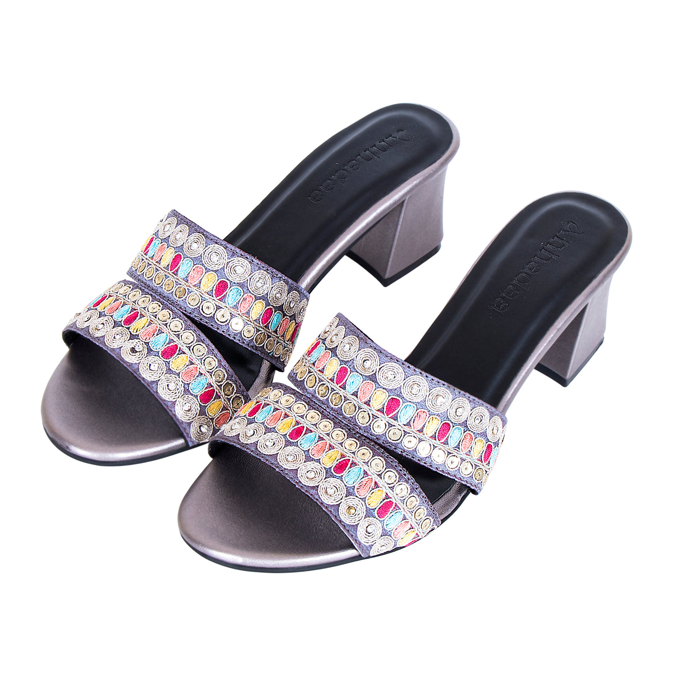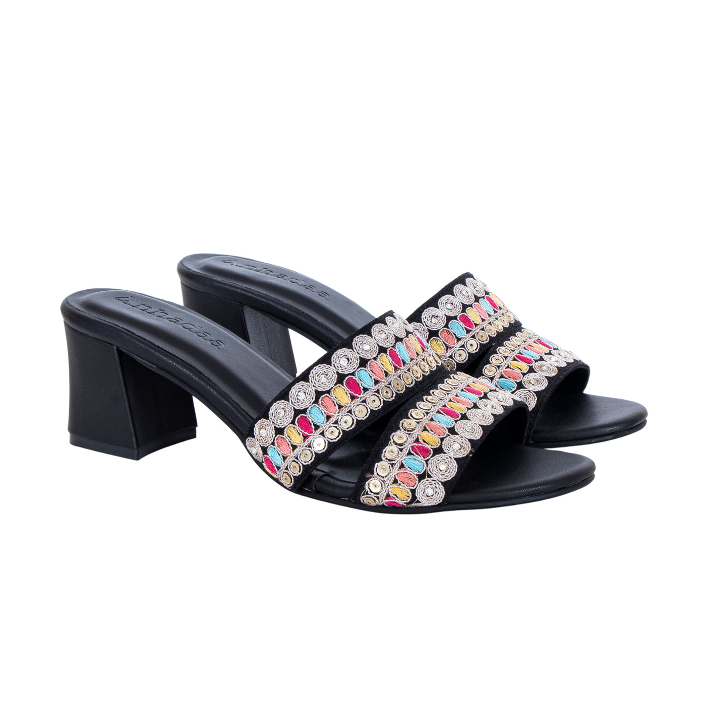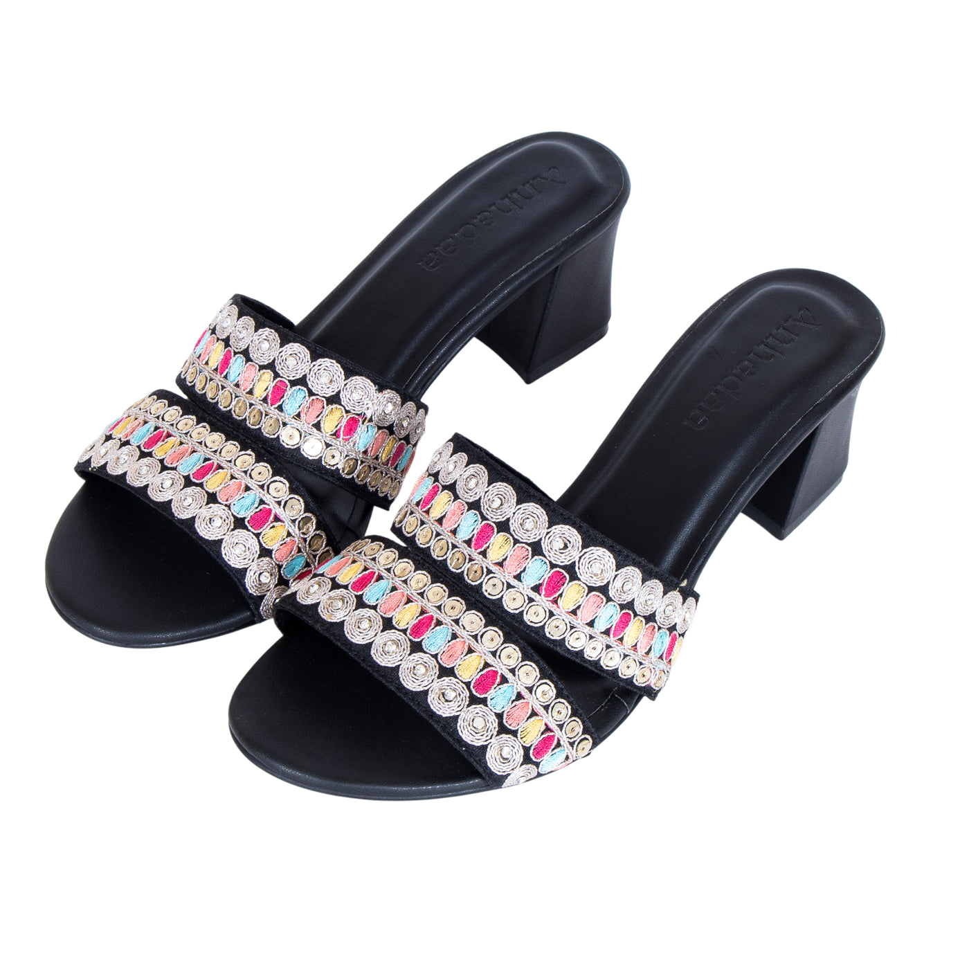 Add a vibrant touch to your festive wardrobe with these beautifully embroidered block heel sandals. Designed with dual straps featuring intricate multicolor thread work and delicate embellishments, this pair blends traditional charm with modern elegance.