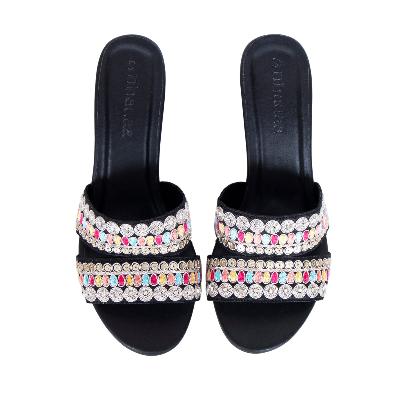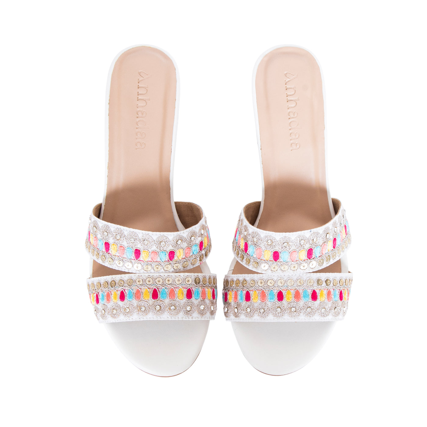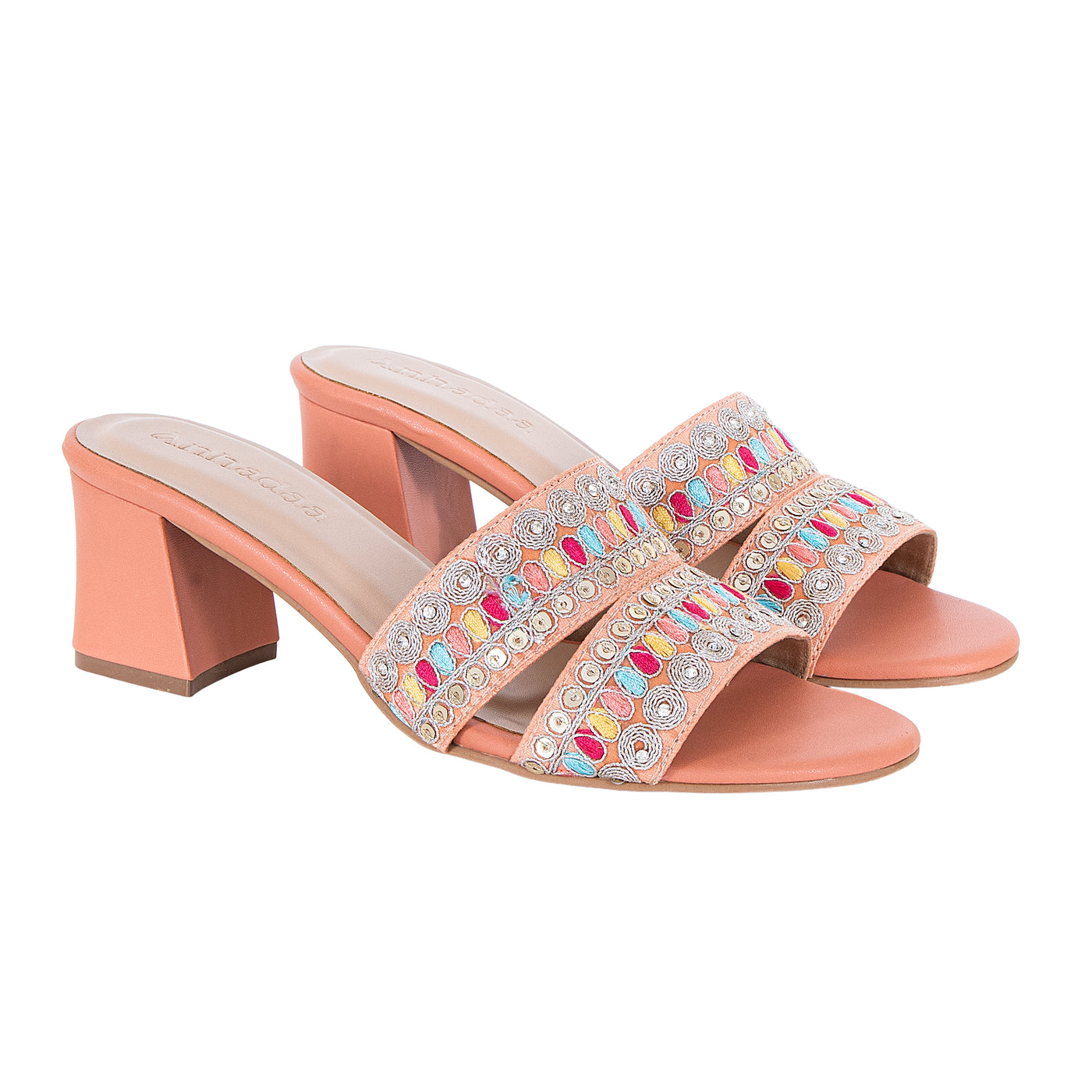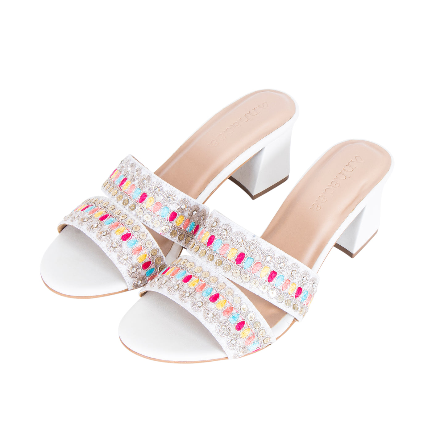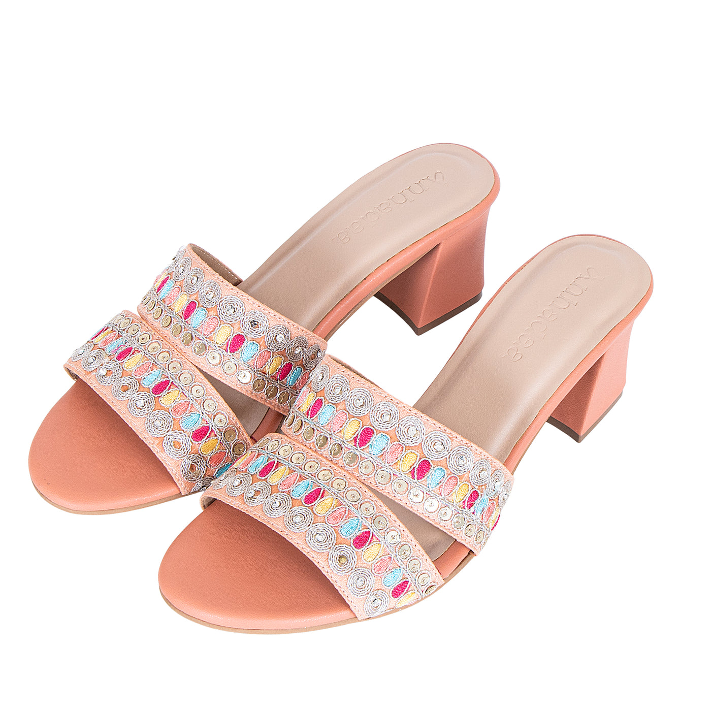 Add a vibrant touch to your festive wardrobe with these beautifully embroidered block heel sandals. Designed with dual straps featuring intricate multicolor thread work and delicate embellishments, this pair blends traditional charm with modern elegance.