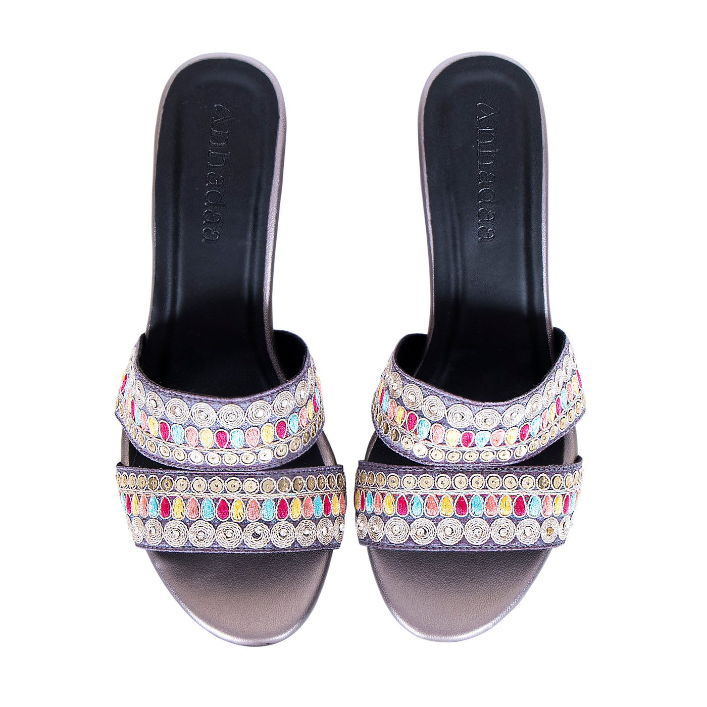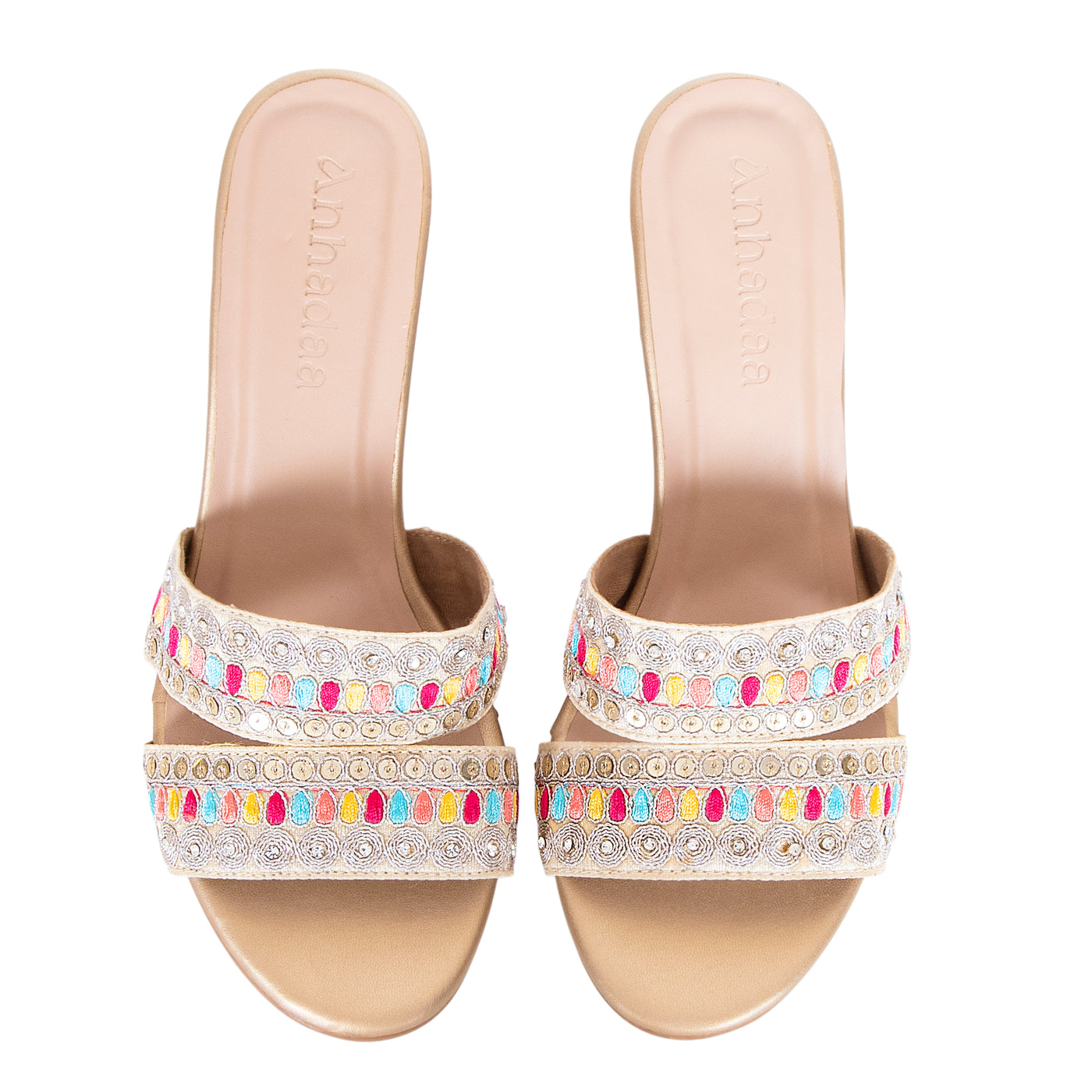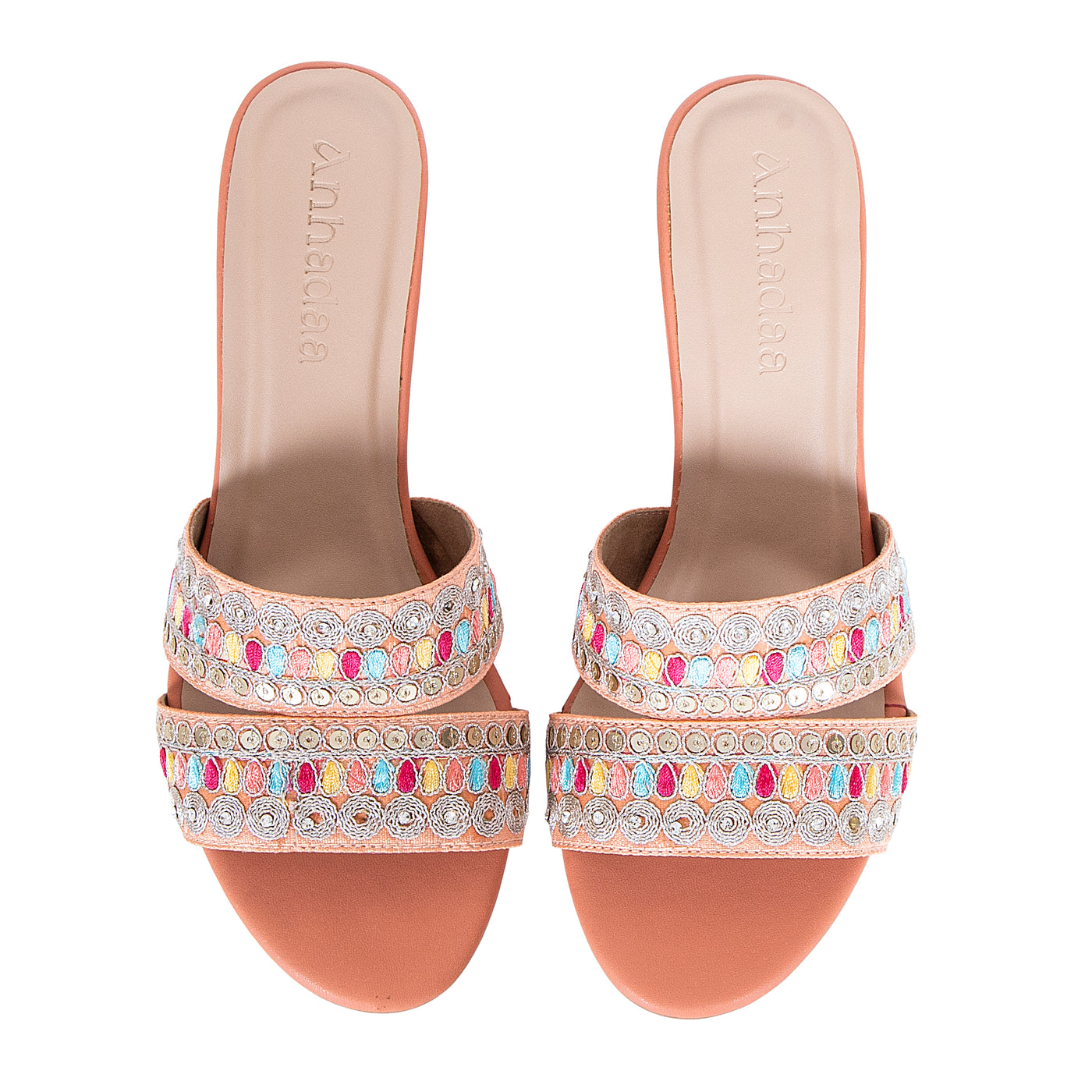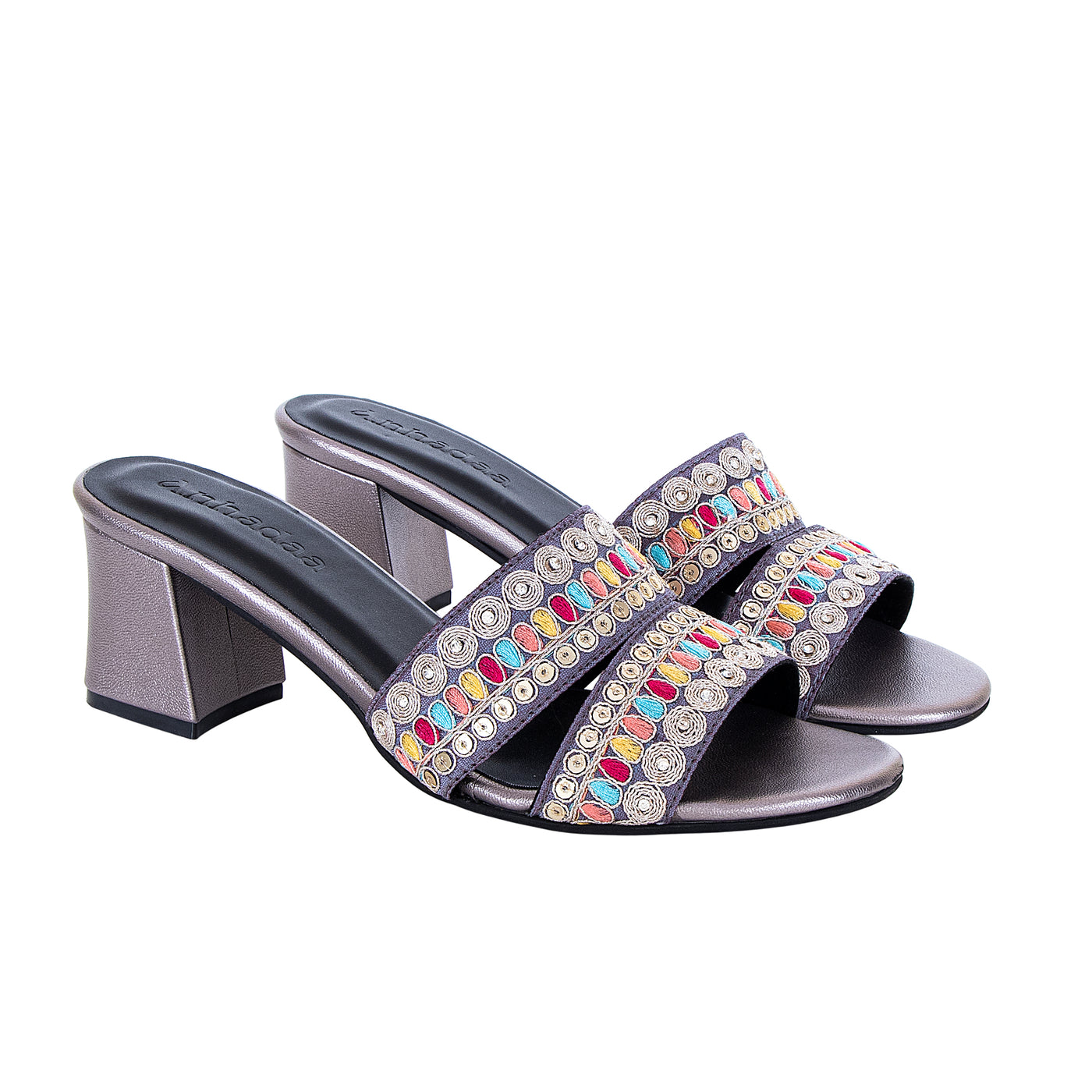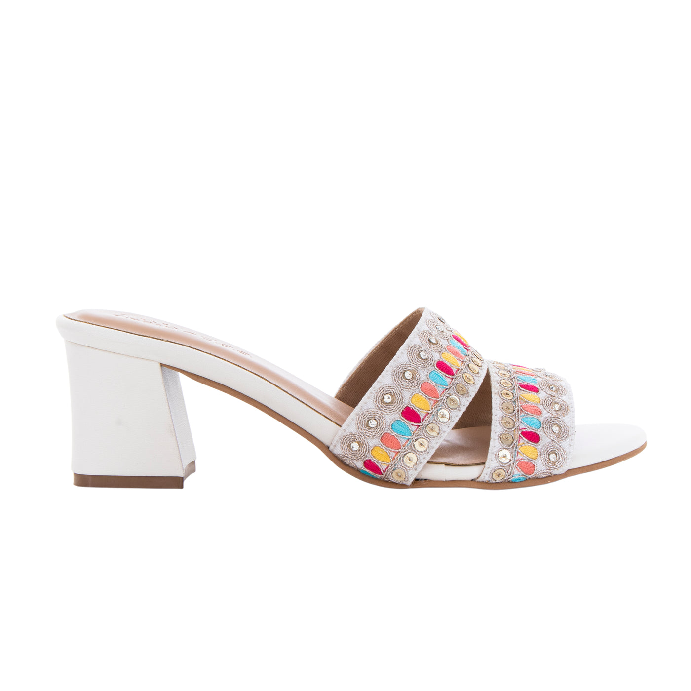 Add a vibrant touch to your festive wardrobe with these beautifully embroidered block heel sandals. Designed with dual straps featuring intricate multicolor thread work and delicate embellishments, this pair blends traditional charm with modern elegance.