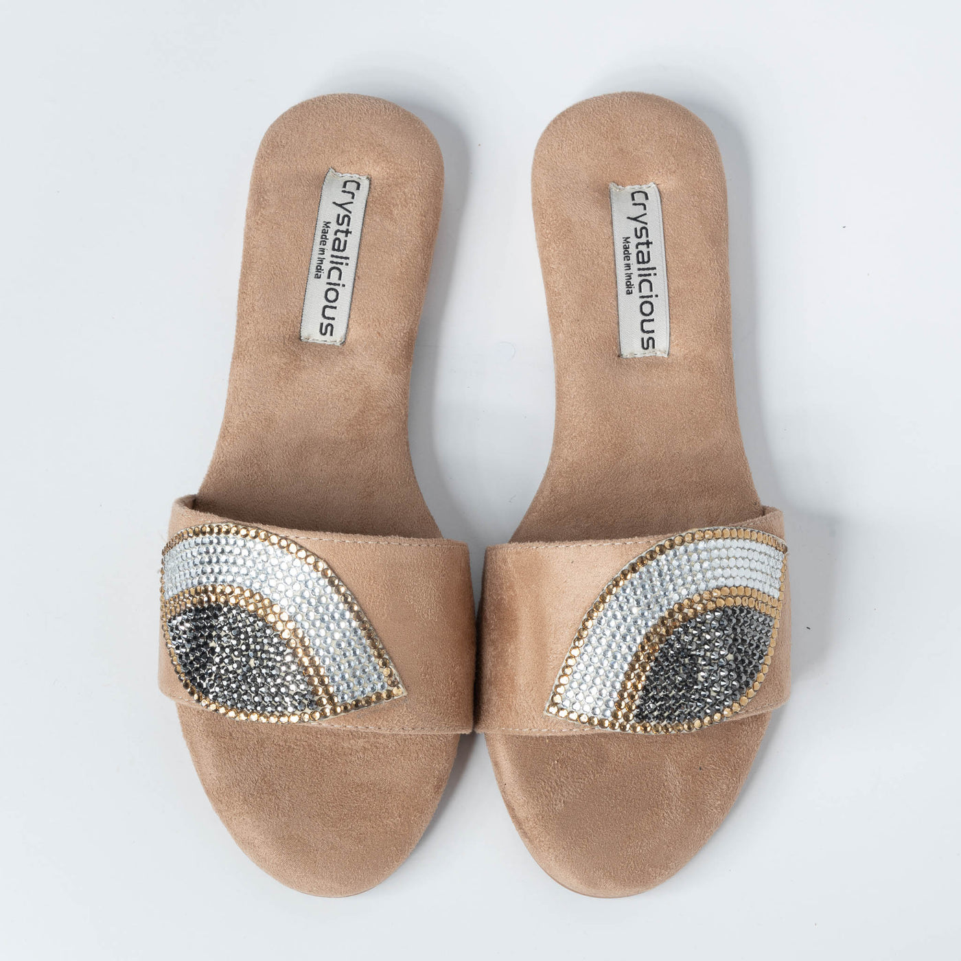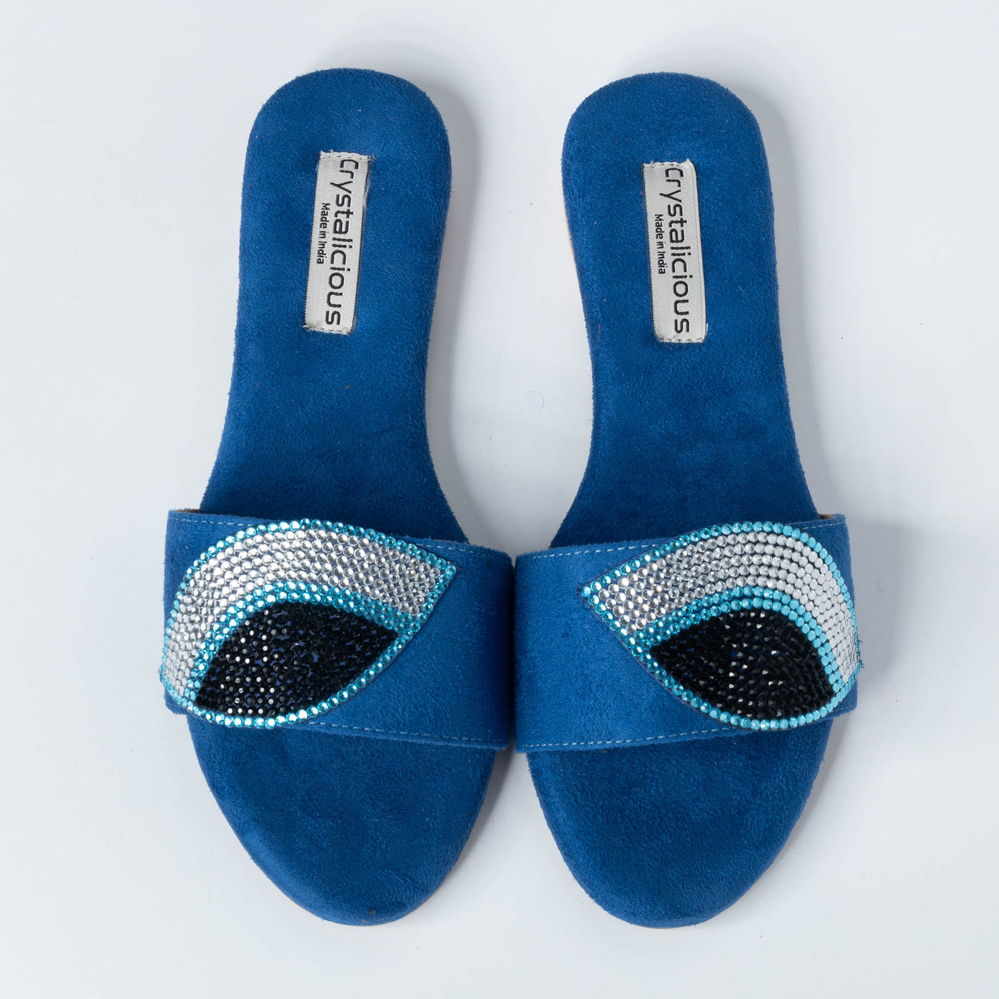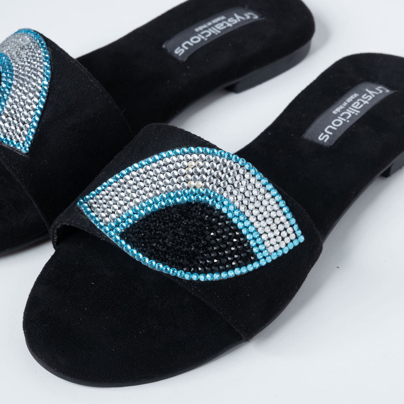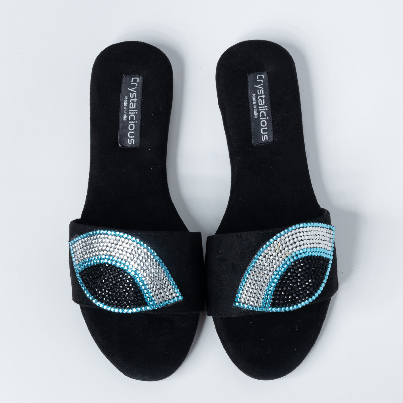 Enhance your style with our fashionable flats, featuring a lucky eye design on synthetic suede adorned with rhinestones. Crafted with accuracy by skilled Indian makers, these flats offer both ease and elegance. Perfect for any occasion. Explore the exclusive Crystalicious collection now.
