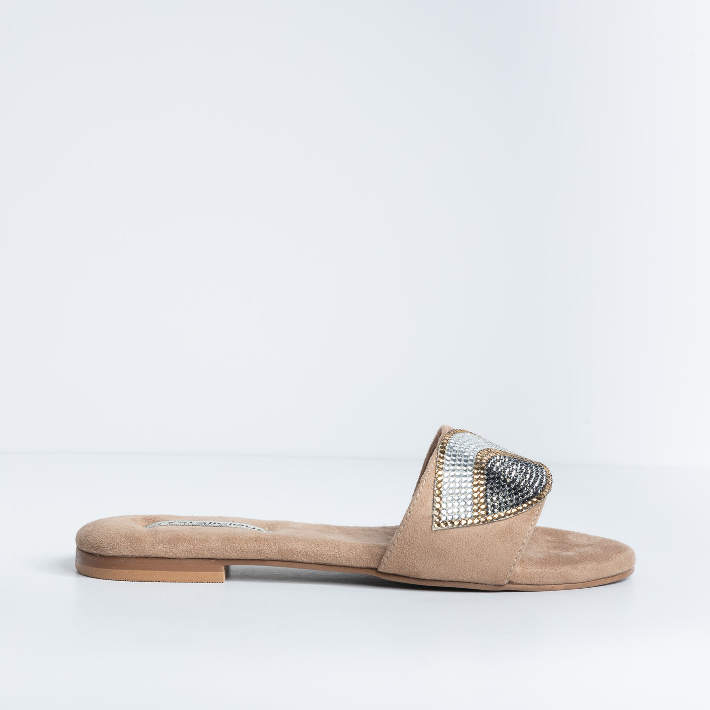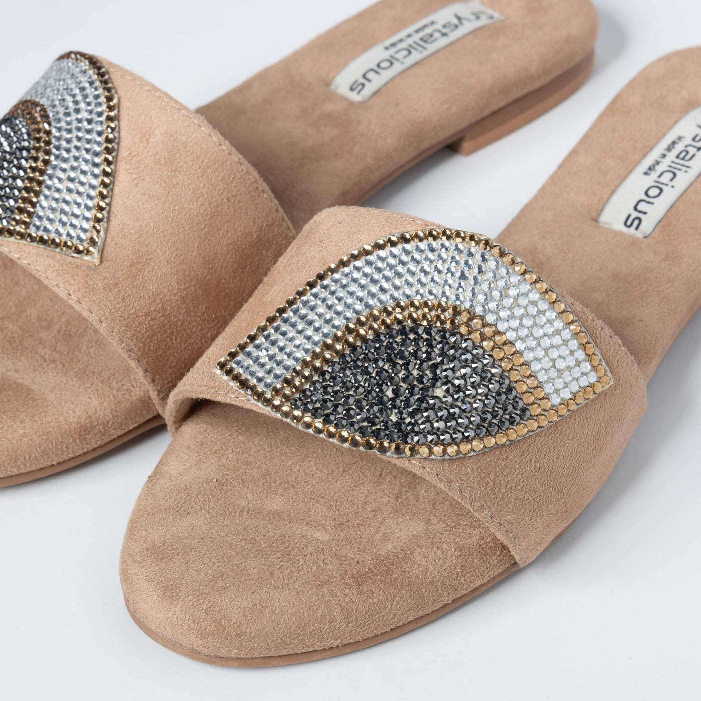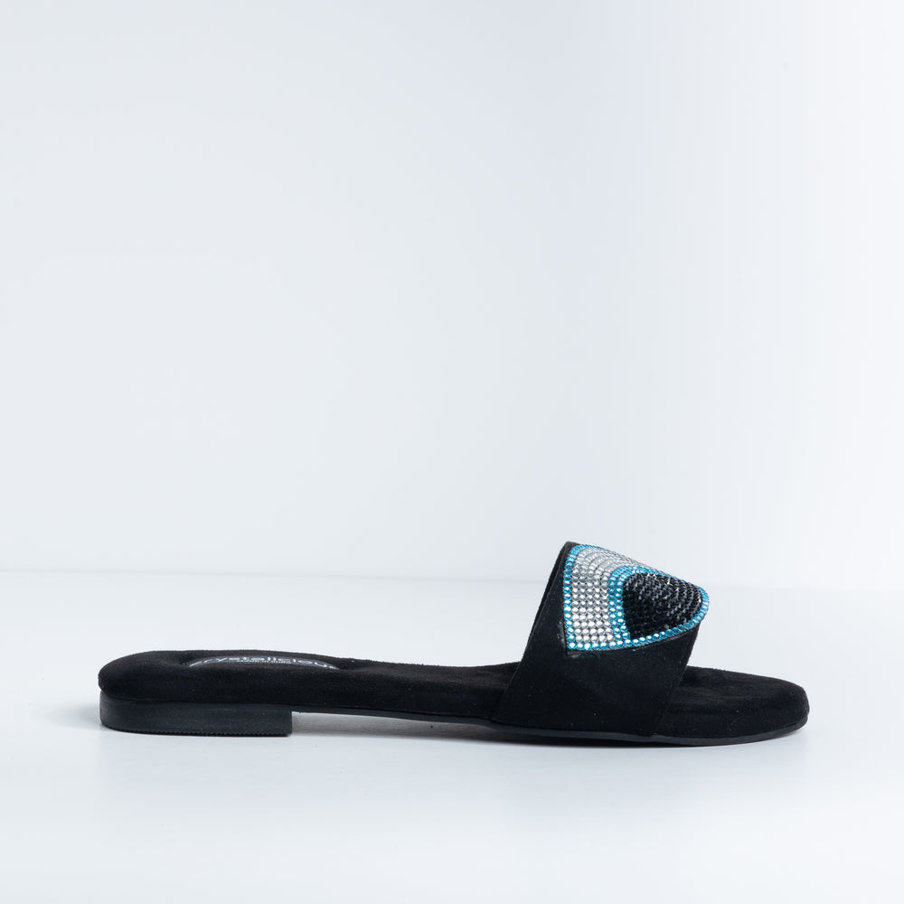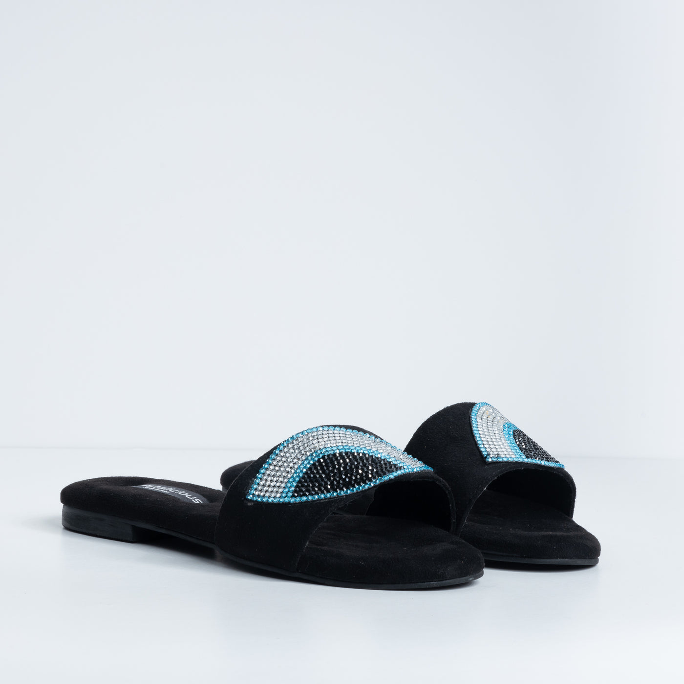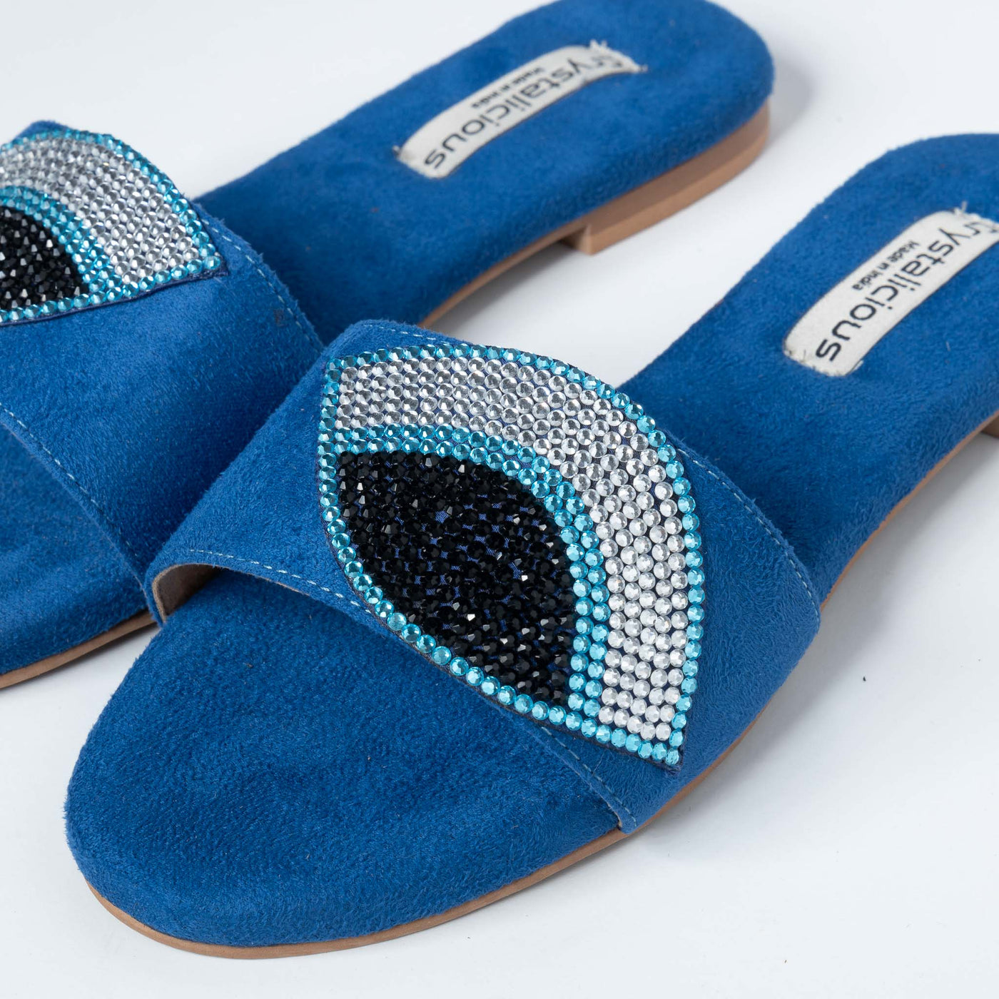 Enhance your style with our fashionable flats, featuring a lucky eye design on synthetic suede adorned with rhinestones. Crafted with accuracy by skilled Indian makers, these flats offer both ease and elegance. Perfect for any occasion. Explore the exclusive Crystalicious collection now.